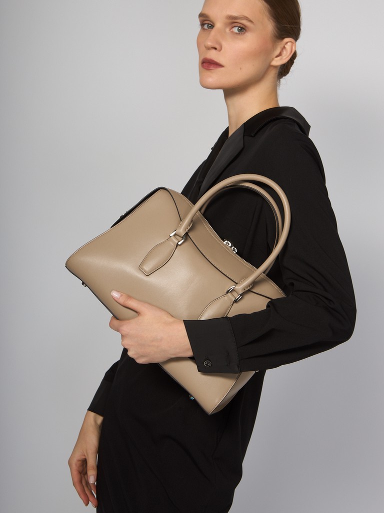Женская сумка торговой марки Eleganzza из натуральной кожи. Модель застегивается на двухзамковую молнию. Содержит внутри один отдел, в котором имеются карман на молнии и открытый карман. Высота ручки - 12,5 см. Максимальная длина регулируемого съемного плечевого ремня из натуральной кожи - 124 см, ширина - 2,5 см. Модель имеет ножки на дне. Вмещает формат А4.