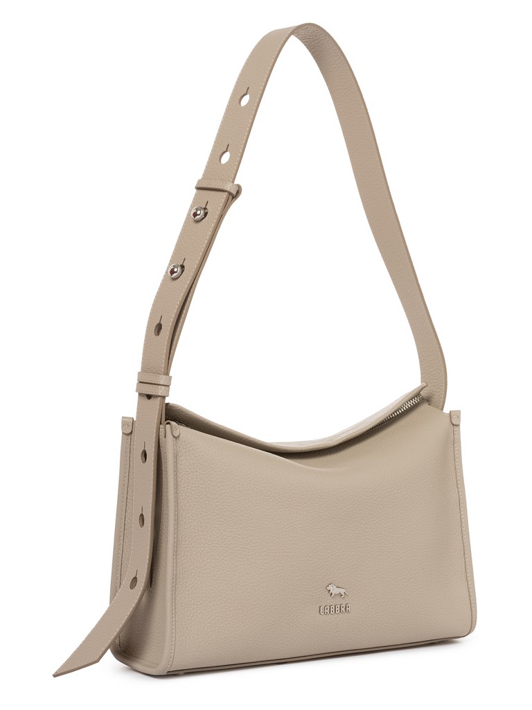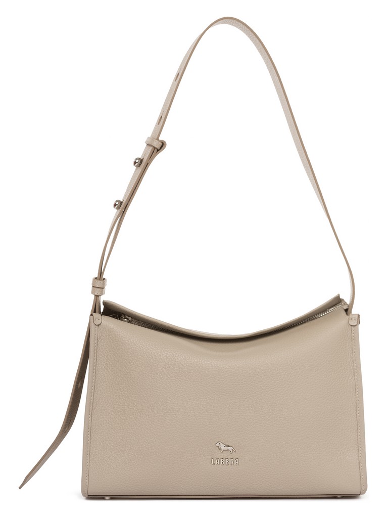 Женская сумка торговой марки Labbra из натуральной кожи. Модель закрывается на металлическую молнию, имеет одно отделение, которое содержит внутри карман на молнии и два открытых кармана. На задней стенке - карман на молнии. Высота ручки - 35 см. Модель имеет ножки на дне. Не вмещает формат А4.