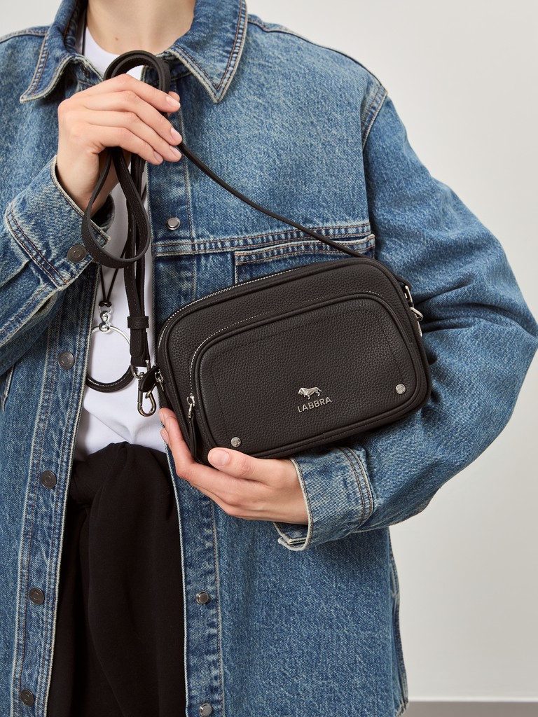 Женская сумка торговой марки Labbra из натуральной кожи. Модель имеет два самостоятельных отделения, которые закрываются на металлические молнии. Заднее отделение внутри содержит карман на молнии. Переднее отделение внутри содержит четыре отделения для пластиковых карт. На задней стенке -  карман на молнии. На передней стенке - карман на молнии. Длина наплечного ремня из натуральной кожи - 118 см., ширина - 1,5 см. Модель не имеет ножки на дне.