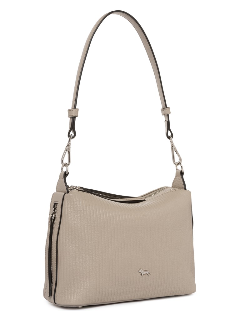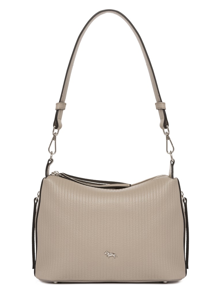 Женская сумка торговой марки Labbra из натуральной кожи. Модель имеет два отделения, которые закрываются на металлические молнии. Внутри два открытых кармана и карман на молнии. Два внешних кармана на металлической молнии расположены по бокам сумки. Высота съёмной ручки - 30 см. Длина наплечного ремня из натуральной кожи со вставками из металлической цепочки - 110 см., ширина - 1,4 см. Модель имеет ножки на дне.