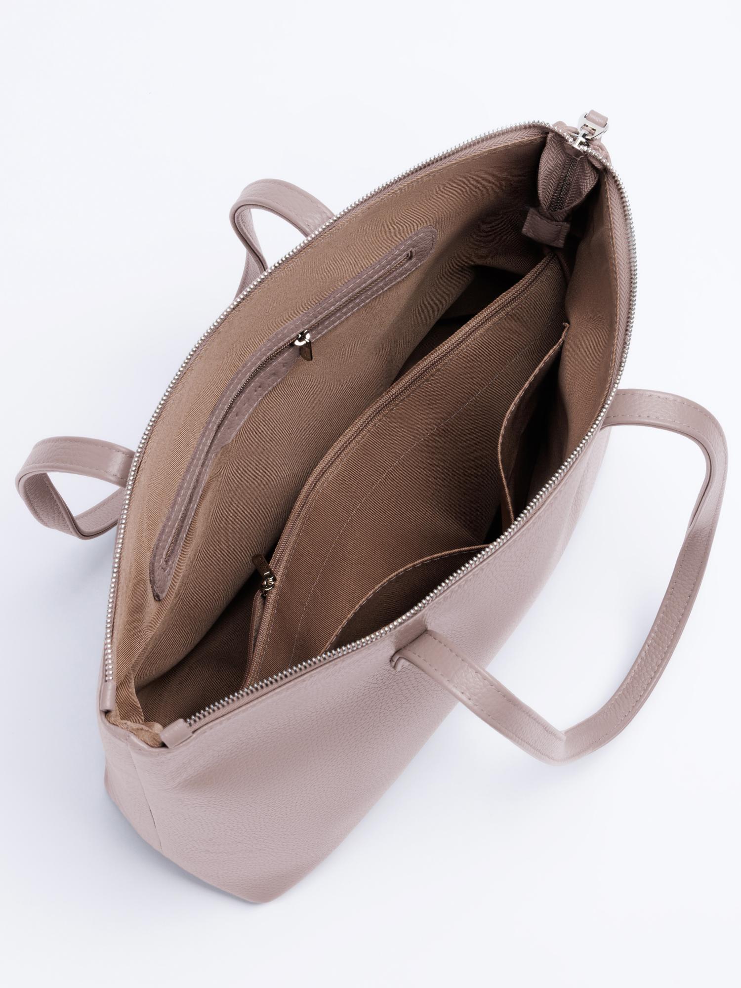 Внутри сумки перегородка на молнии для удобного разделения пространства, а также карман на молнии для хранения мелких предметов (паспорт и т.п.) и два открытых кармашка для смартфона или других вещей.
