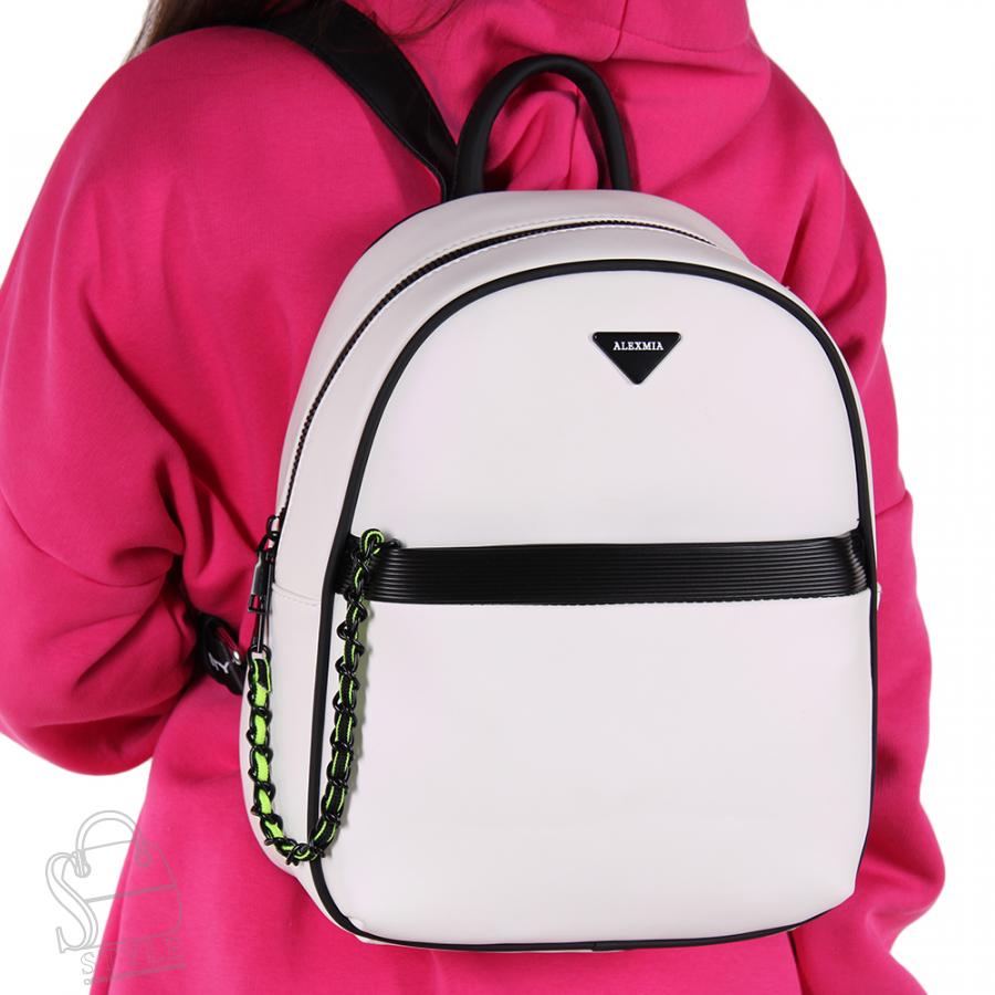 Рюкзак, выполнена из матовой экокожи. Декорирован цепочкой. Дополнен серебристой фурнитурой. Данная модель закрывается на молнию. Каркас полужесткий. Носится в руке или на плече.