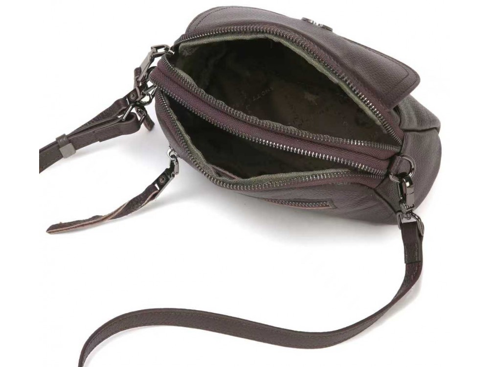 Сумка кросс-боди. В комплекте кожаный ремень с возможностью регулировки. Два основных отделения. Внутри: два кармана для аксессуаров, один из которых застегивается на молнию. Снаружи: спереди вместительный отдел под клапаном на магнитной клепке. Сзади: карман для мелочей на молнии.