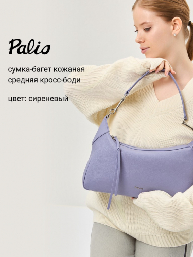 Женская сумка торговой марки Palio из натуральной кожи. Модель застегивается на молнию. Содержит внутри один отдел, в котором имеются три кармана (один из них на молнии). На задней стенке есть карман на молнии. Высота съемной ручки - 26 см. Максимальная длина съемного регулируемого плечевого ремня из текстиля – 116 см, ширина – 5 см. Модель не имеет ножки на дне. Не вмещает формат А4.