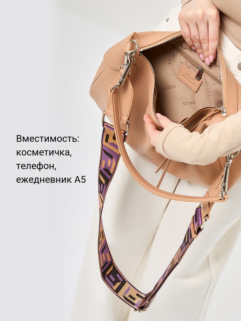Женская сумка торговой марки Palio из натуральной кожи. Модель застегивается на молнию. Содержит внутри один отдел, в котором имеются три кармана (один из них на молнии). На задней стенке есть карман на молнии. Высота съемной ручки - 26 см. Максимальная длина съемного регулируемого плечевого ремня из текстиля – 116 см, ширина – 5 см. Модель не имеет ножки на дне. Не вмещает формат А4.