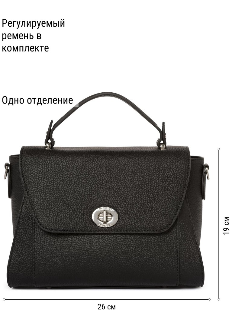 Женская сумка торговой марки Eleganzza из натуральной кожи. Модель закрывается на клапан с поворотным замком и металлическую молнию. Внутри одно отделение с карманом на молнии и двумя открытыми карманами. На задней стенке - карман на молнии. Высота ручки - 8 см. Длина наплечного ремня из натуральной кожи - 118 см., ширина - 1,7 см. Модель имеет ножки на дне. Не вмещает формат А4.