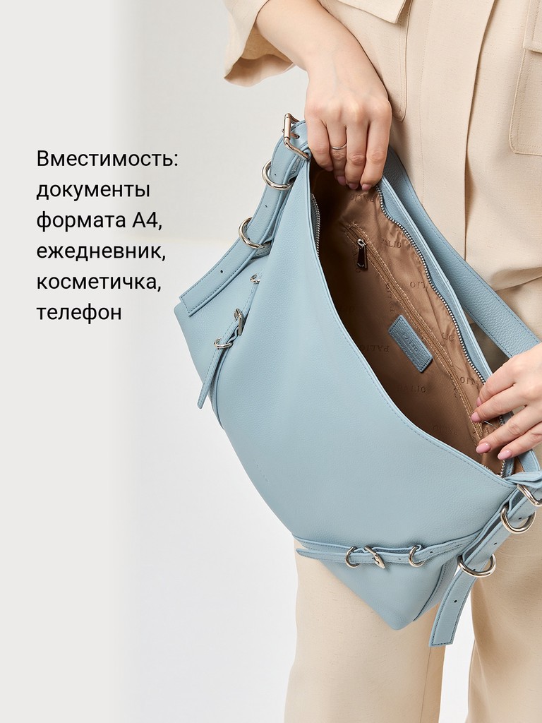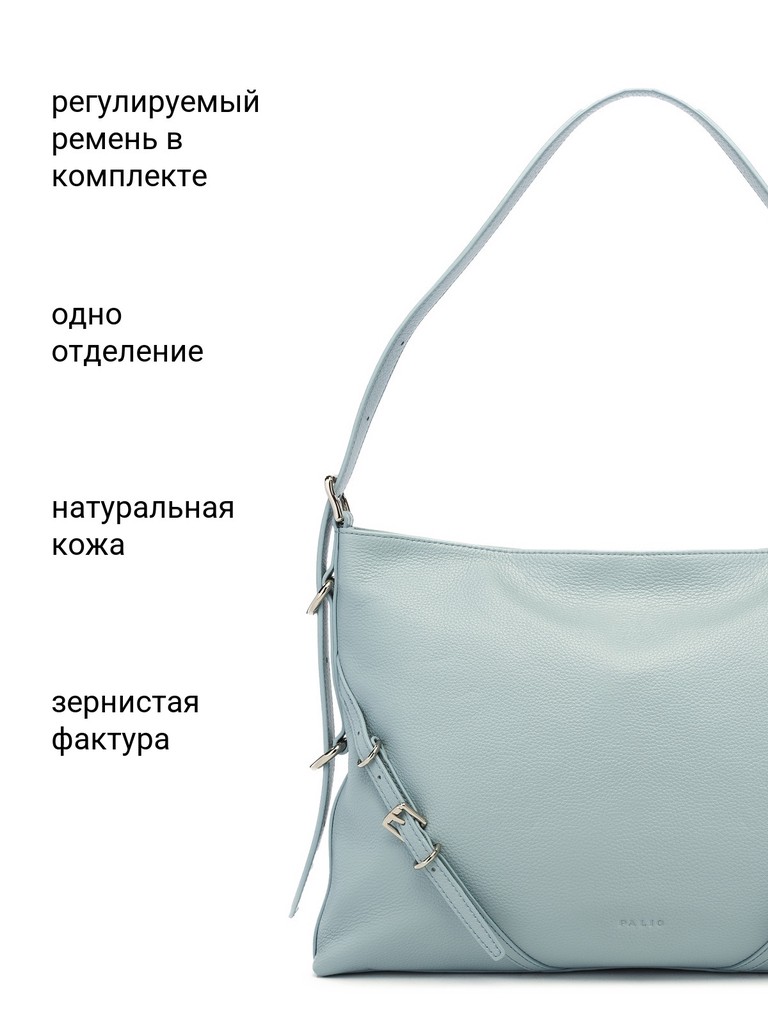 Женская сумка торговой марки Palio из натуральной кожи. Модель застегивается на молнию. Содержит внутри один отдел, в котором есть два открытых кармана и карман на молнии. На задней стенке есть карман на молнии. Минимальная высота ручек – 13 см, ручки трансформируются в плечевой ремень. Максимальная длина регулируемого съемного плечевого ремня из натуральной кожи – 49 см, ширина – 3 см. Модель не имеет ножки на дне. Вмещает формат А4.