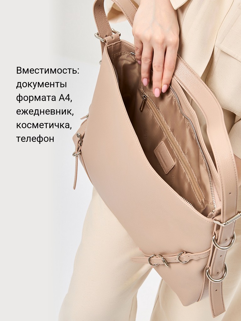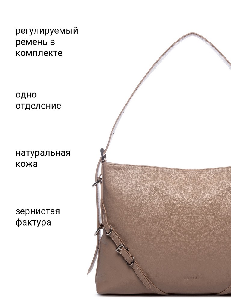 Женская сумка торговой марки Palio из натуральной кожи. Модель застегивается на молнию. Содержит внутри один отдел, в котором есть два открытых кармана и карман на молнии. На задней стенке есть карман на молнии. Минимальная высота ручек – 13 см, ручки трансформируются в плечевой ремень. Максимальная длина регулируемого съемного плечевого ремня из натуральной кожи – 49 см, ширина – 3 см. Модель не имеет ножки на дне. Вмещает формат А4.