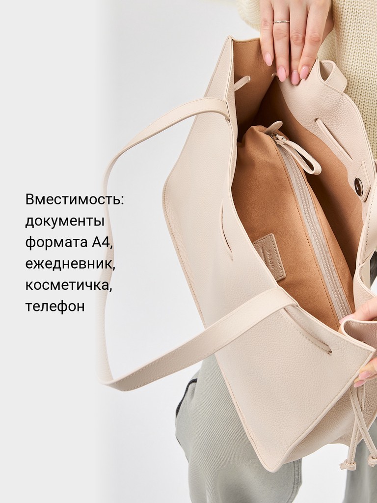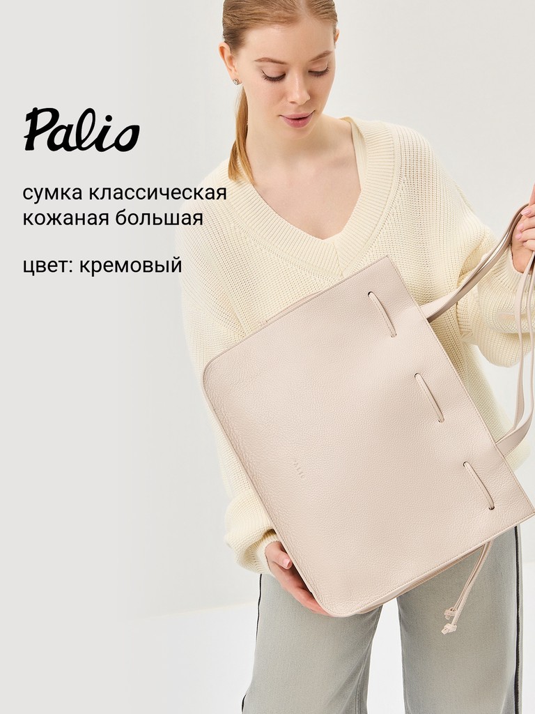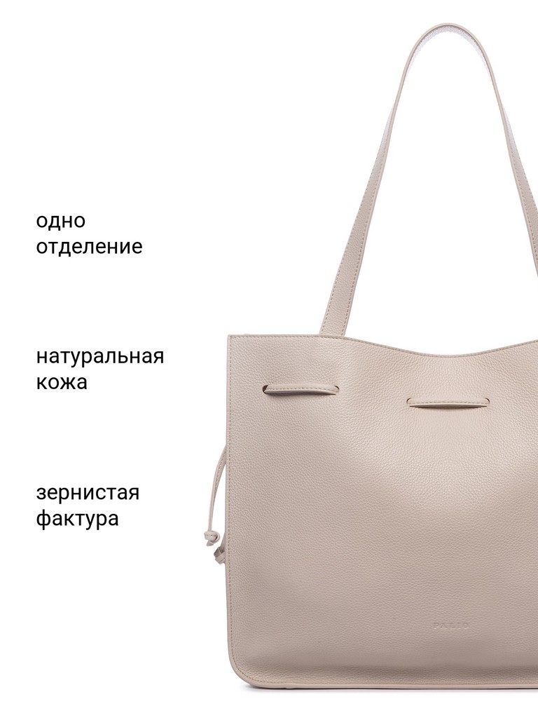 Женская сумка торговой марки Palio из натуральной кожи. Модель затягивается шнурами и застегивается на магнитную кнопку. Содержит внутри один отдел, в котором имеется съемное отделение на молнии. Высота ручек – 24,5 см. Модель не имеет ножки на дне. Вмещает формат А4.