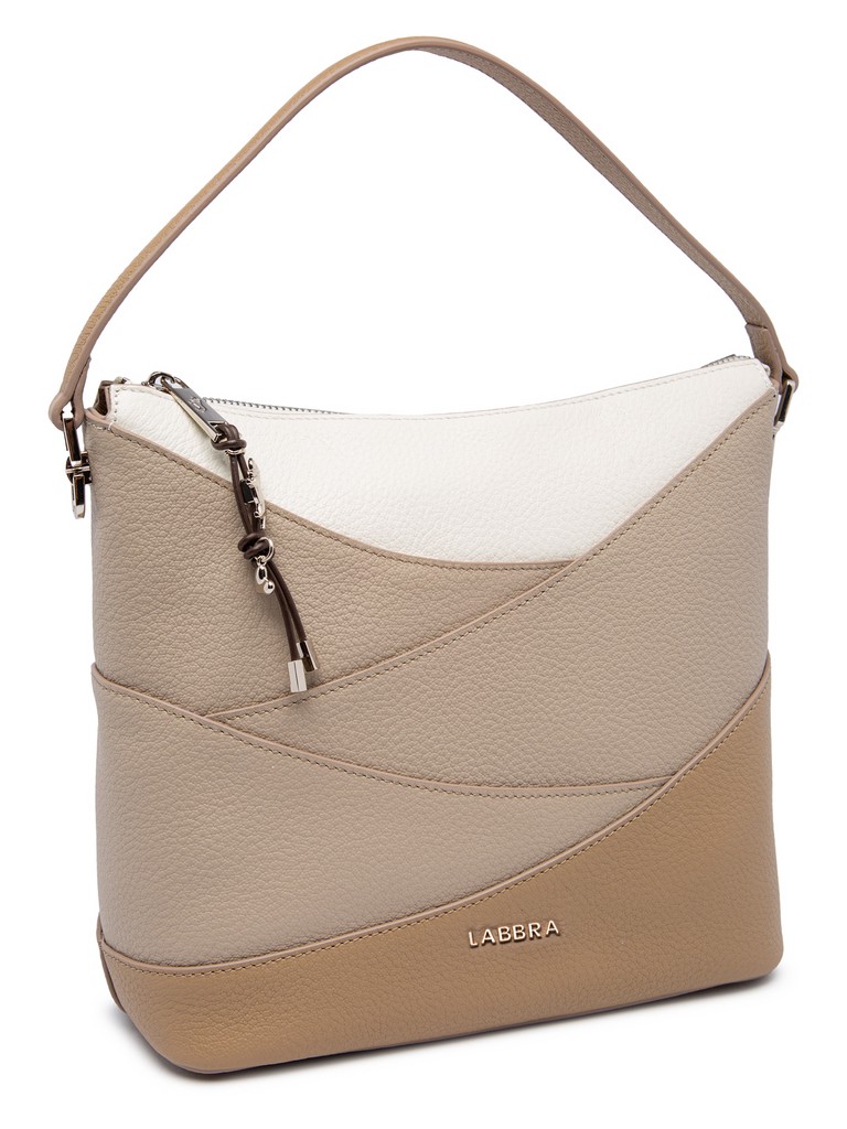 Женская сумка торговой марки Labbra из натуральной кожи. Новая айдентика любимого бренда представлена в оригинальной подвеске из кожи с авторской фурнитурой. Модель застегивается на молнию. Содержит внутри один отдел, в котором имеются карман на молнии и два открытых кармана. Высота ручки - 12 см. Максимальная длина регулируемого съемного плечевого ремня из натуральной кожи - 117 см, ширина - 1,5 см.  Модель имеет ножки на дне. Не вмещает формат А4.