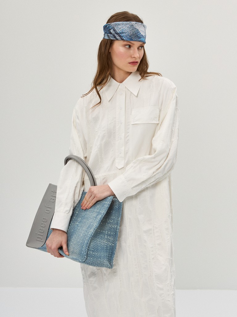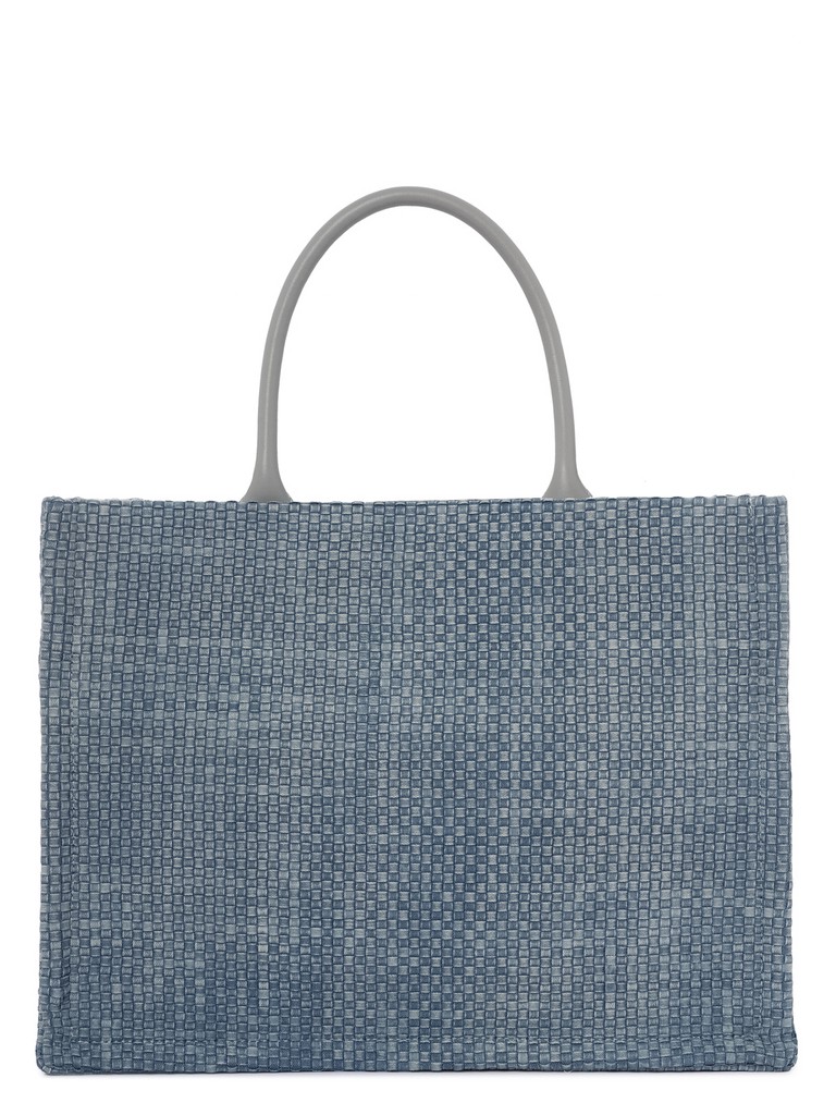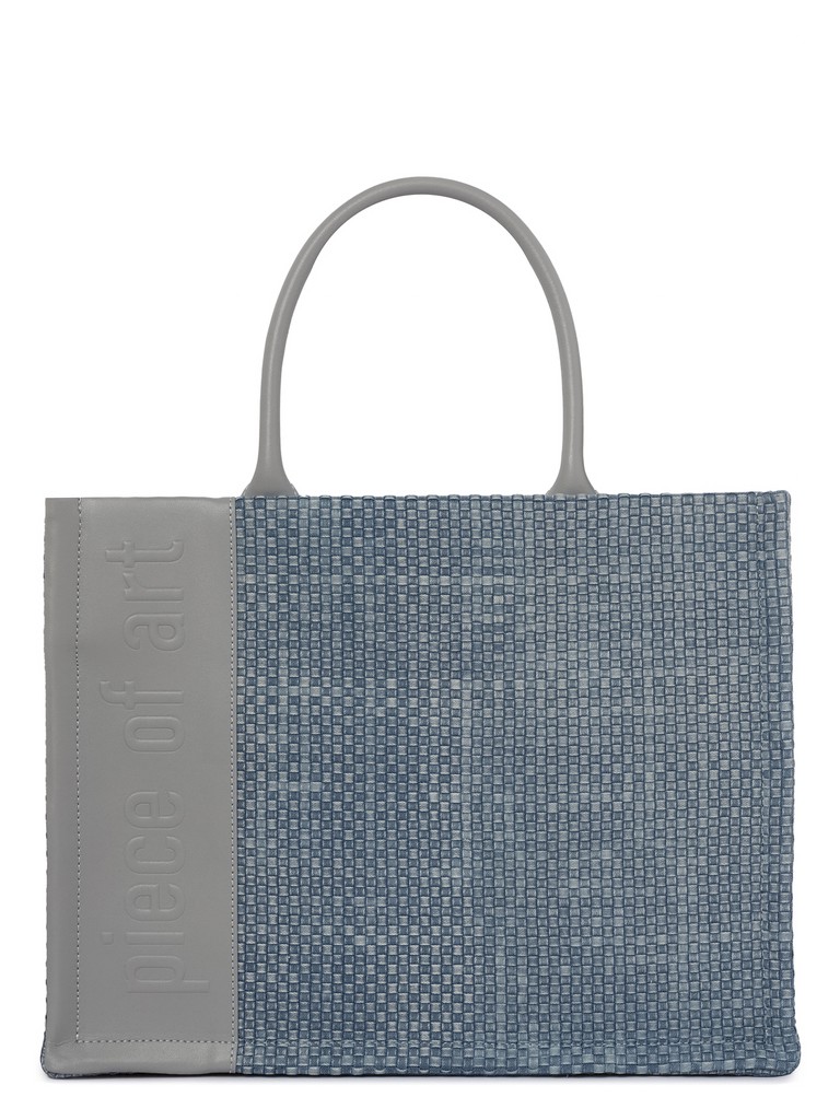 Женская сумка торговой марки Eleganzza выполнена из плетеного полотна джинсовой ткани, что делает её легкой и стильной. Отделка из натуральной кожи с тиснением "Piece of Art" подчеркивает уникальность изделия. Внутри одно отделение с двумя карманами на молнии, открытым карманом и вкладной косметичкой. Косметичка застегивается на молнию. Высота ручек - 16 см. Длина регулируемого съемного плечевого ремня из текстиля - 112 см, ширина - 4 см. Модель не имеет ножки на дне. Вмещает формат А4.