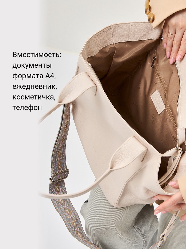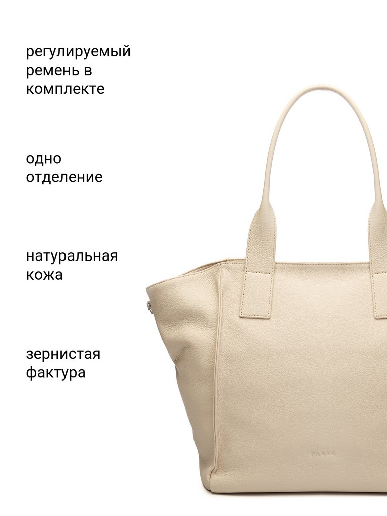 Женская сумка торговой марки Palio из натуральной кожи. Модель застегивается на молнию. Содержит внутри один отдел, в котором есть два открытых кармана и карман на молнии. На задней стенке есть карман на молнии. Высота ручек – 22 см. Максимальная длина регулируемого съемного плечевого ремня из текстиля - 117 см, ширина – 5 см. Модель не имеет ножки на дне. Вмещает формат А4.