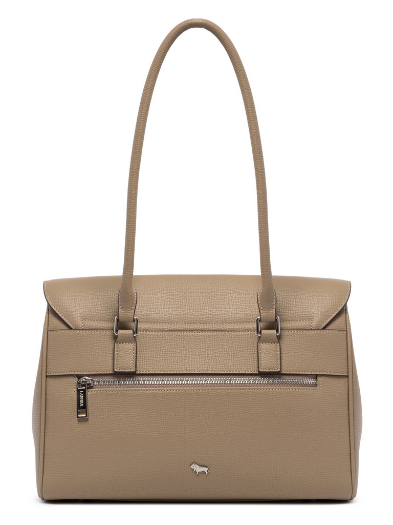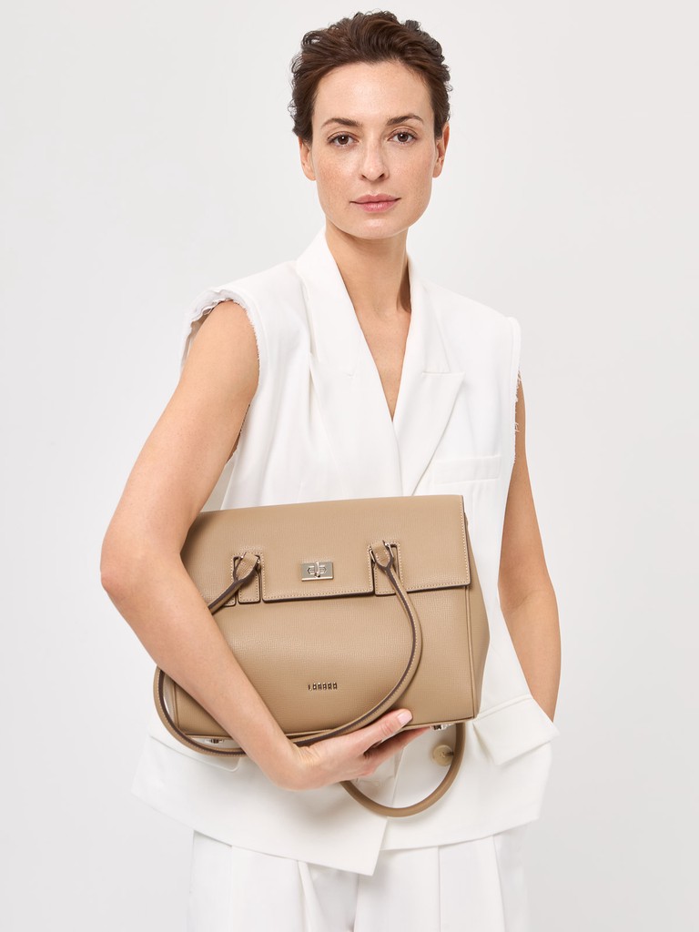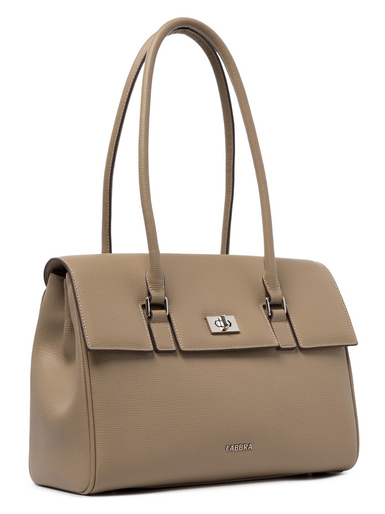 Женская сумка торговой марки Labbra из натуральной кожи. Модель закрывается клапаном на замок. Содержит внутри два отдела, между которыми имеется отделение на молнии. В одном отделе имеется карман на липучке, в другом - открытый карман. На задней стенке есть карман на молнии, в котором имеется петля из тесьмы для фиксации сумки на ручке чемодана. Высота ручек - 25 см. Модель имеет ножки на дне. Не вмещает формат А4.
