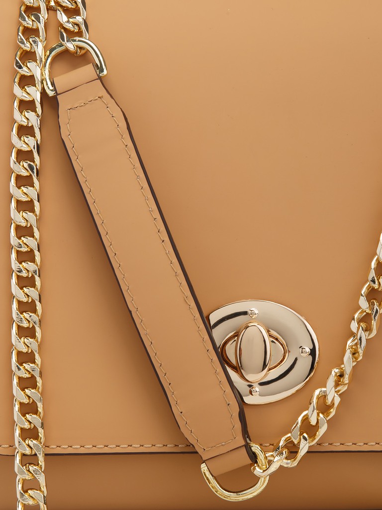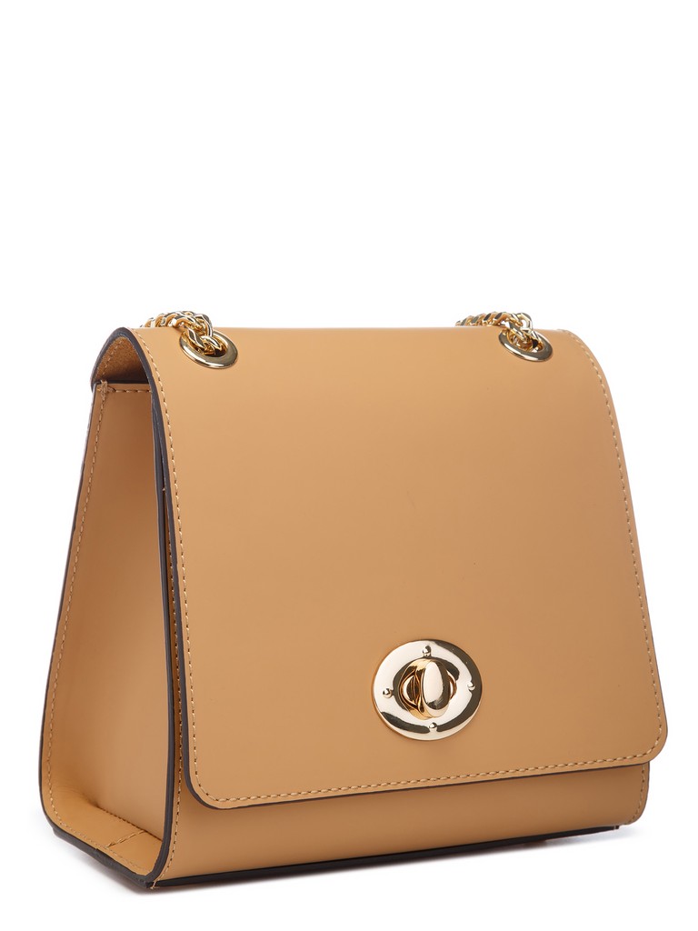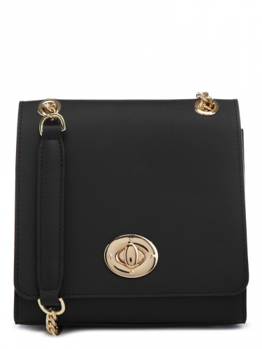 Женская сумка торговой марки Eleganzza из натуральной кожи. Модель закрывается клапаном на замок. Содержит внутри один отдел, в котором имеется открытый карман. На задней стенке есть открытый карман. Высота ручки из металлической цепочки со вставкой из кожи - 60 см. Ручка трансформируется из одной в две. Высота двух ручек - 30 см. Модель имеет ножки на дне. Не вмещает формат А4.