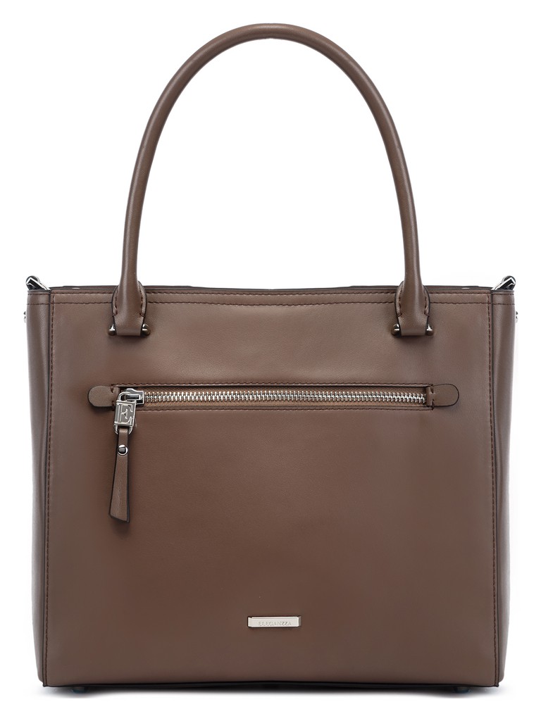 Женская сумка торговой марки Eleganzza из натуральной кожи. Модель имеет три отделения. Центральное отделение закрывается на металлическую молнию и содержит внутри карман на молнии и открытый карман. Дополнительные отделения закрываются на магнитные кнопки. На задней стенке - карман на молнии. Высота ручек - 15 см.  Длина наплечного ремня из натуральной кожи - 95 см., ширина - 2.5 см. Модель имеет ножки на дне. Не вмещает формат А4.