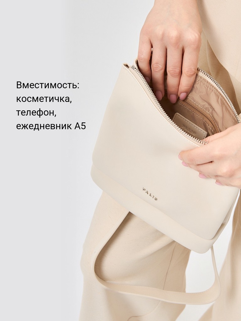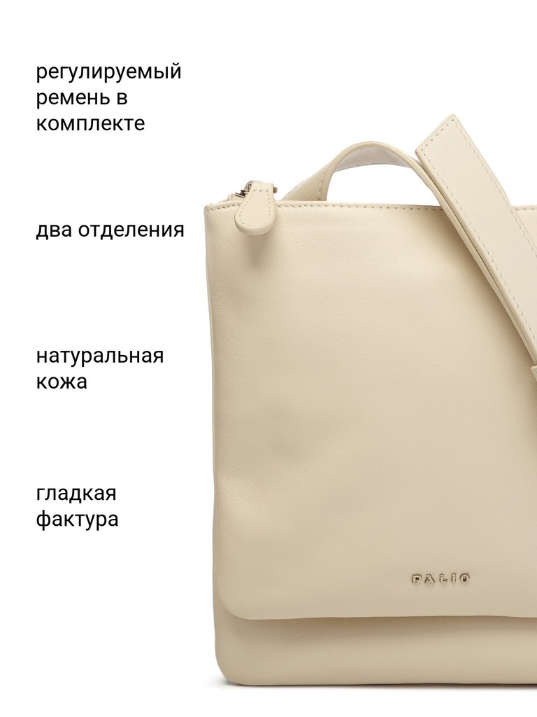 Женская сумка торговой марки Palio из натуральной кожи. Модель застегивается на молнию. Содержит внутри два отдела. В одном отделе имеется открытый карман, в другом - карман на молнии. Максимальная длина регулируемого плечевого ремня из натуральной кожи – 124 см, ширина – 3 см. Модель не имеет ножки на дне. Не вмещает формат А4.