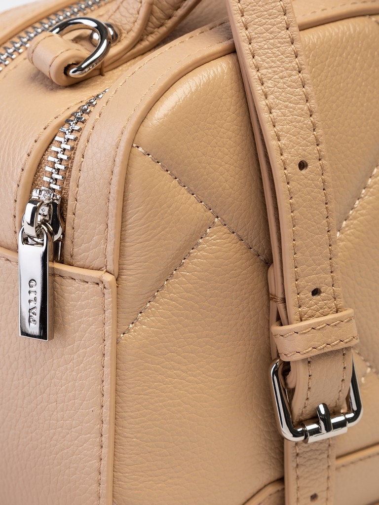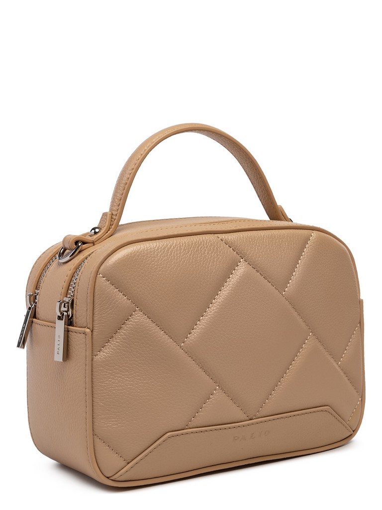 Женская сумка торговой марки Palio из натуральной кожи. Модель имеет два самостоятельных отделения, которые закрываются на металлические молнии. Заднее отделение внутри содержит карман на молнии, переднее отделение внутри содержит открытый карман. Высота ручки - 7 см. Длина наплечного ремня из натуральной кожи - 118 см., ширина - 1,5 см. Модель не имеет ножки на дне. Не вмещает формат А4.