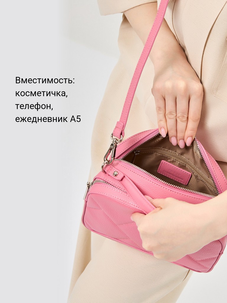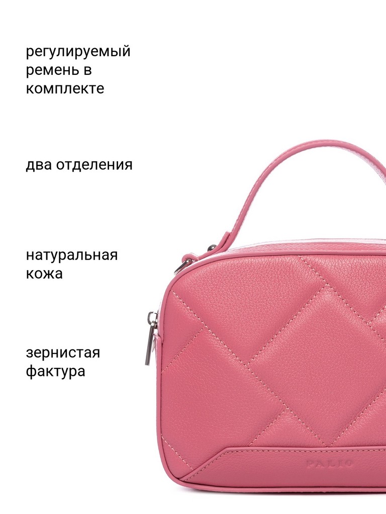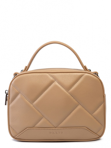 Женская сумка торговой марки Palio из натуральной кожи. Модель имеет два самостоятельных отделения, которые закрываются на металлические молнии. Заднее отделение внутри содержит карман на молнии, переднее отделение внутри содержит открытый карман. Высота ручки - 7 см. Длина наплечного ремня из натуральной кожи - 118 см., ширина - 1,5 см. Модель не имеет ножки на дне. Не вмещает формат А4.