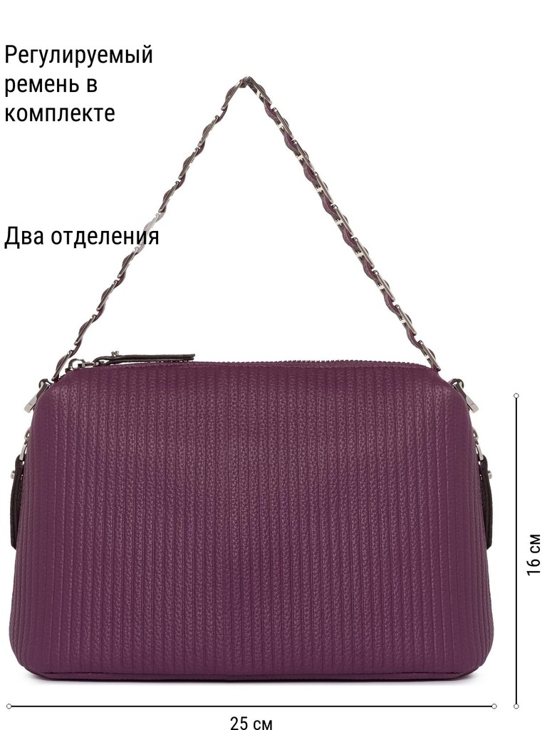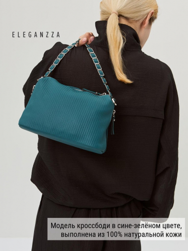 Женская сумка торговой марки ELEGANZZA. Модель закрывается на металлическую молнию и имеет два отделения, разделенные средником на молнии. Внутри два открытых кармана и карман на молнии. Высота ручки - 13 см. Длина наплечного ремня из натуральной кожи - 118 см, ширина 1,2 см. Модель имеет два боковых кармана, не имеет ножки на дне, не вмещает формат А4.