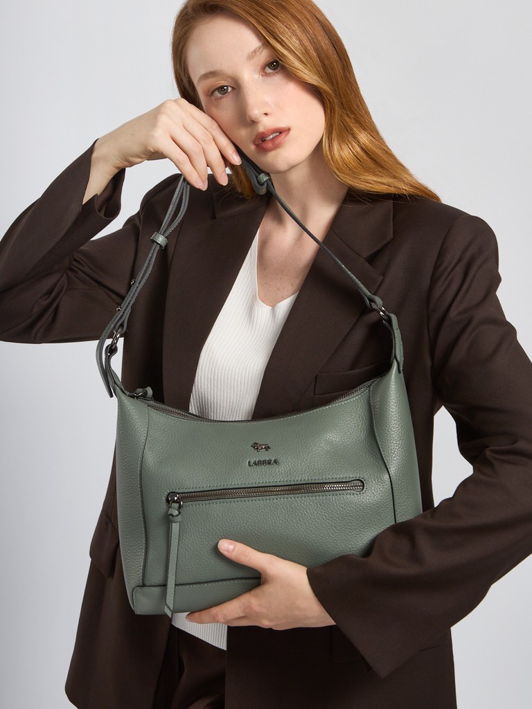 Женская сумка торговой марки Labbra из натуральной кожи. Модель застегивается на молнию. Содержит внутри один отдел, в котором имеются карман на молнии и два открытых кармана. На передней стенке есть карман на молнии. Высота ручки - 28 см. Модель не имеет ножки на дне. Не вмещает формат А4.