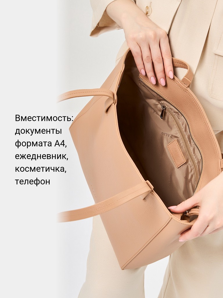 Женская сумка торговой марки Palio из натуральной кожи. Модель закрывается на металлическую молнию и имеет внутри одно отделение с карманом на молнии и двумя открытыми карманами. На задней стенке - карман на молнии. Высота ручек - 29 см. Модель не имеет ножки на дне. Вмещает формат А4.
