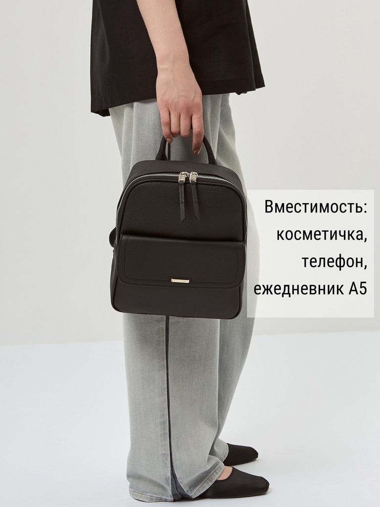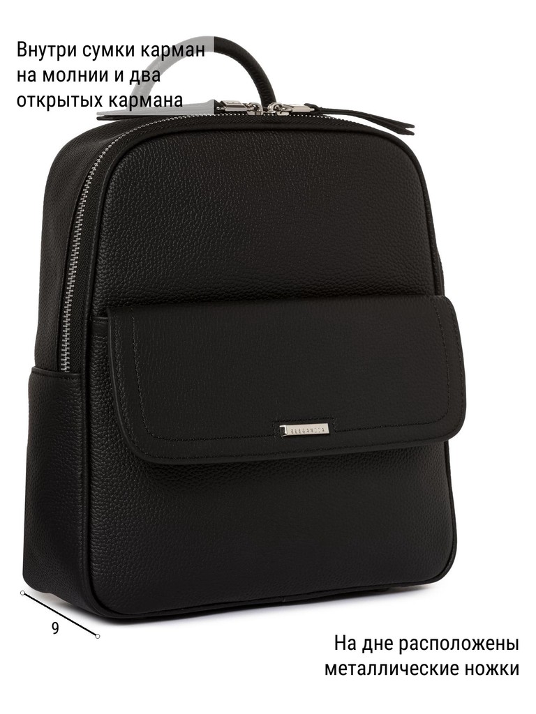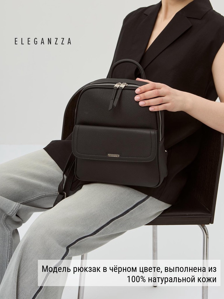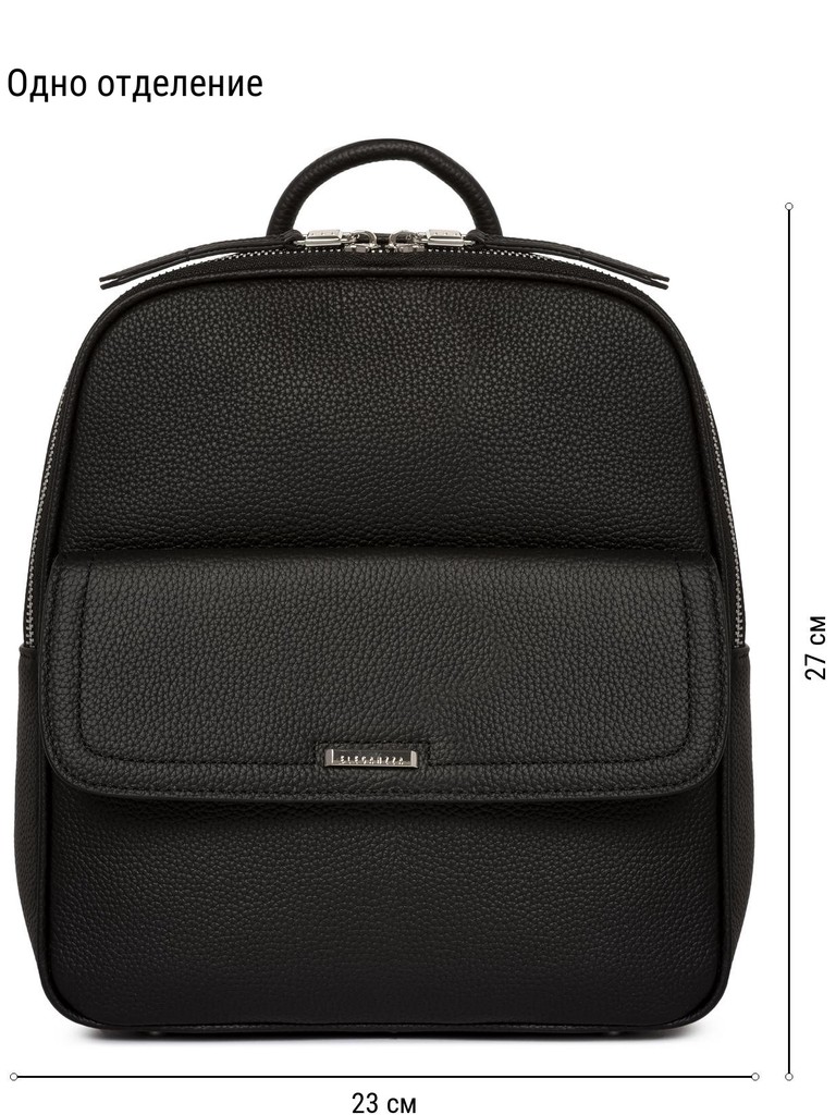 Женский рюкзак торговой марки Eleganzza из натуральной кожи. Модель застегивается на молнию. Внутри одно отделение, в котором имеются карман на молнии и два открытых кармана. На передней стенке есть карман на магнитной кнопке, на задней - карман на молнии. Высота ручки - 5,5 см. Длина лямки - 65 см., ширина - 2 см. Модель имеет ножки на дне. Не вмещает формат А4.