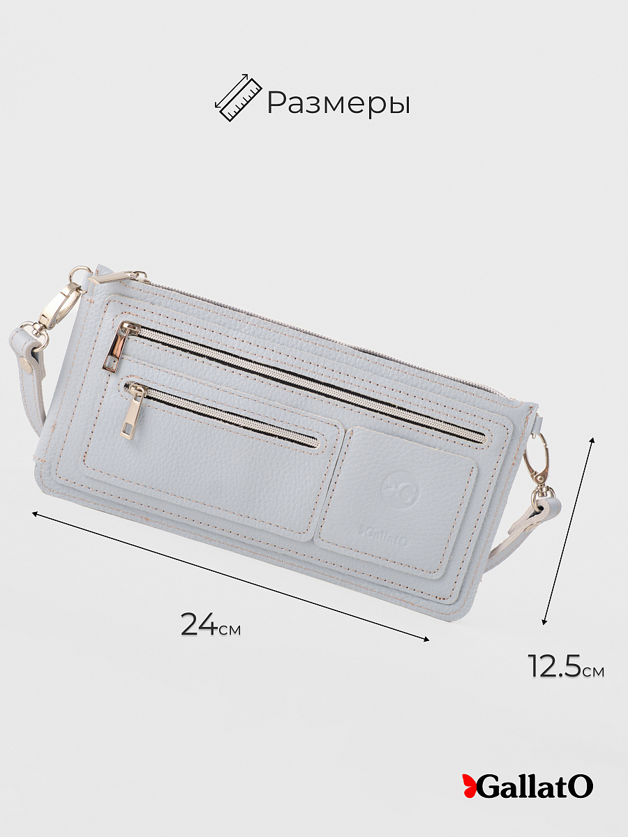 Кожаная сумка-багет Greta от ТМ Gallato. Плоская компактная сумка на длинном плечевом регулируемом  ремне из натуральной кожи. Длина ремня меняется от 106-128 см. У сумки 5 внешних карманов и 1 основное отделение под молнией. Внешние карманы - 2 на молнии, 2 на кнопках и 1 открытый. Идеальный вариант для путешествий, так как в основное отделение идеально ровно и без заломов помещается посадочный билет на самолет или билет на поезд. Удобно проходить таможенные досмотры, или брать с собой на лёгкую прогулку с детьми или собакой.