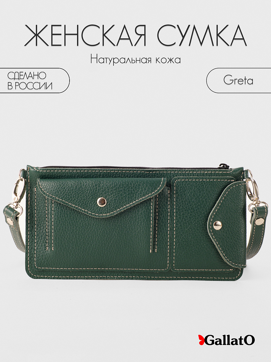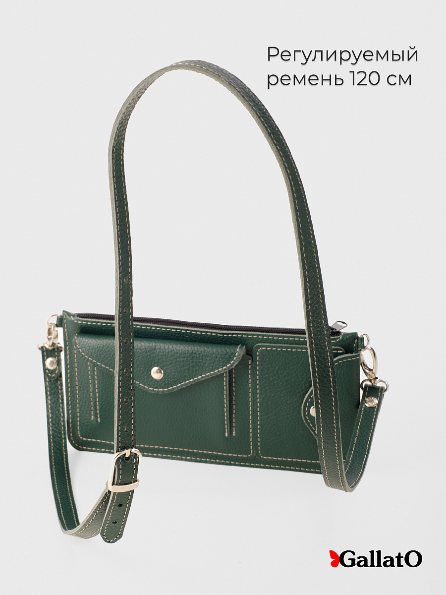 Кожаная сумка-багет Greta от ТМ Gallato. Плоская компактная сумка на длинном плечевом регулируемом  ремне из натуральной кожи. Длина ремня меняется от 106-128 см. У сумки 5 внешних карманов и 1 основное отделение под молнией. Внешние карманы - 2 на молнии, 2 на кнопках и 1 открытый. Идеальный вариант для путешествий, так как в основное отделение идеально ровно и без заломов помещается посадочный билет на самолет или билет на поезд. Удобно проходить таможенные досмотры, или брать с собой на лёгкую прогулку с детьми или собакой.