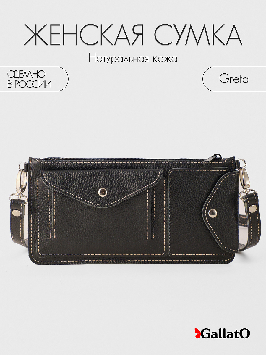 Кожаная сумка-багет Greta от ТМ Gallato. Плоская компактная сумка на длинном плечевом регулируемом  ремне из натуральной кожи. Длина ремня меняется от 106-128 см. У сумки 5 внешних карманов и 1 основное отделение под молнией. Внешние карманы - 2 на молнии, 2 на кнопках и 1 открытый. Идеальный вариант для путешествий, так как в основное отделение идеально ровно и без заломов помещается посадочный билет на самолет или билет на поезд. Удобно проходить таможенные досмотры, или брать с собой на лёгкую прогулку с детьми или собакой.