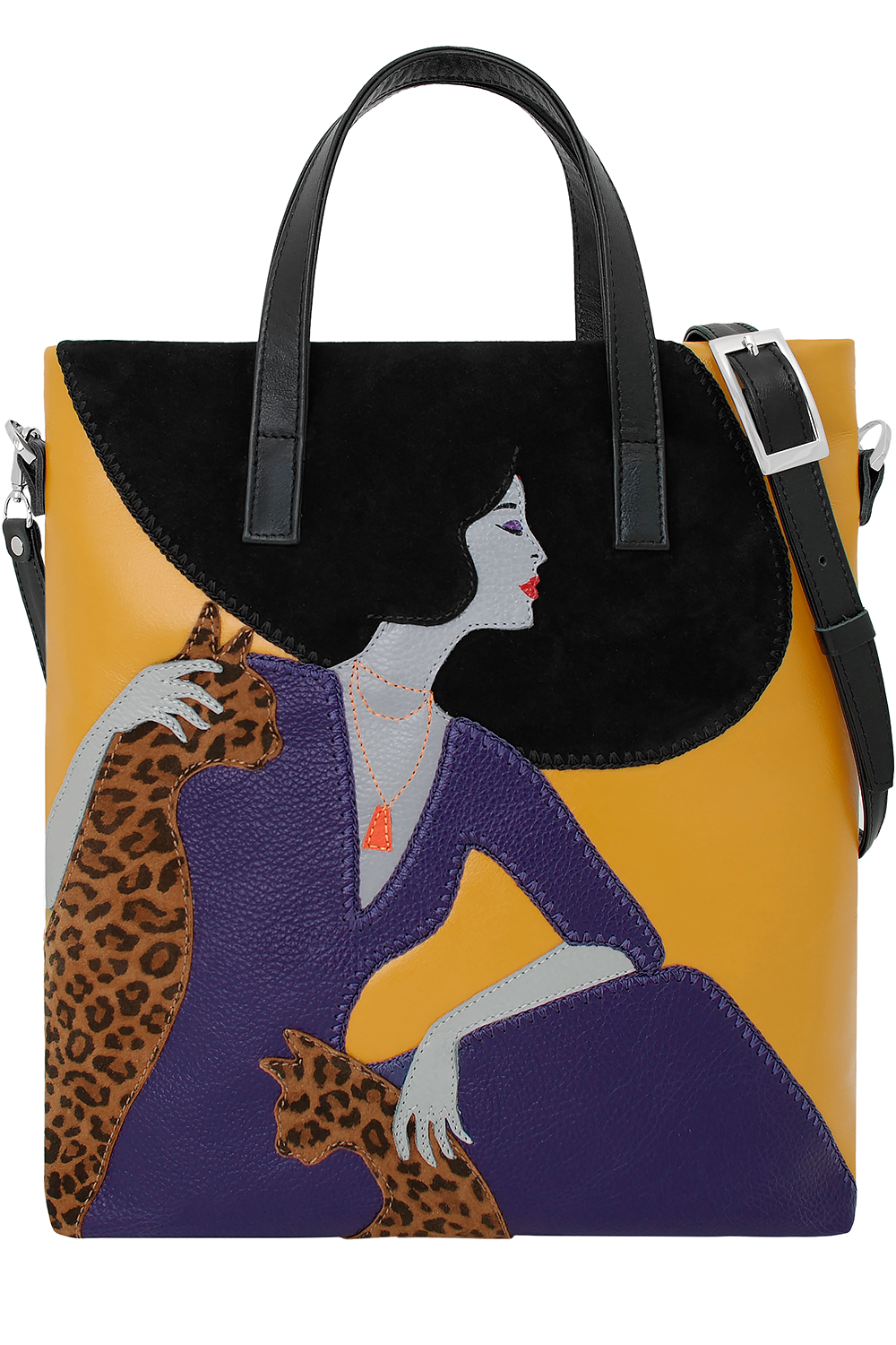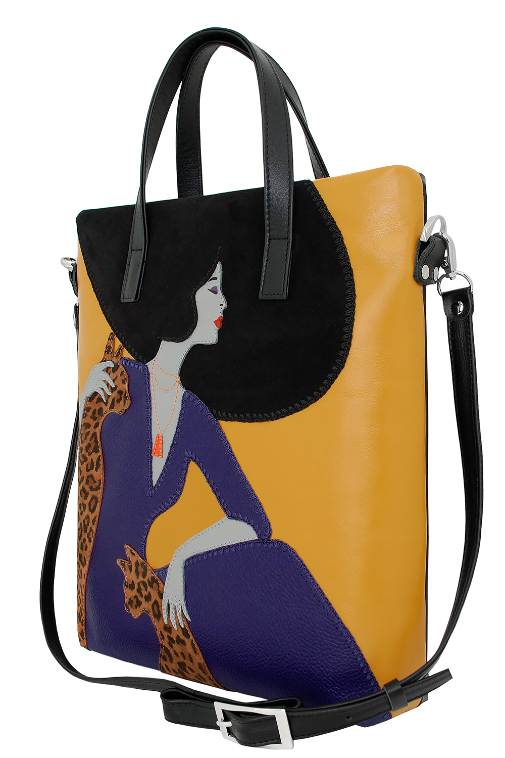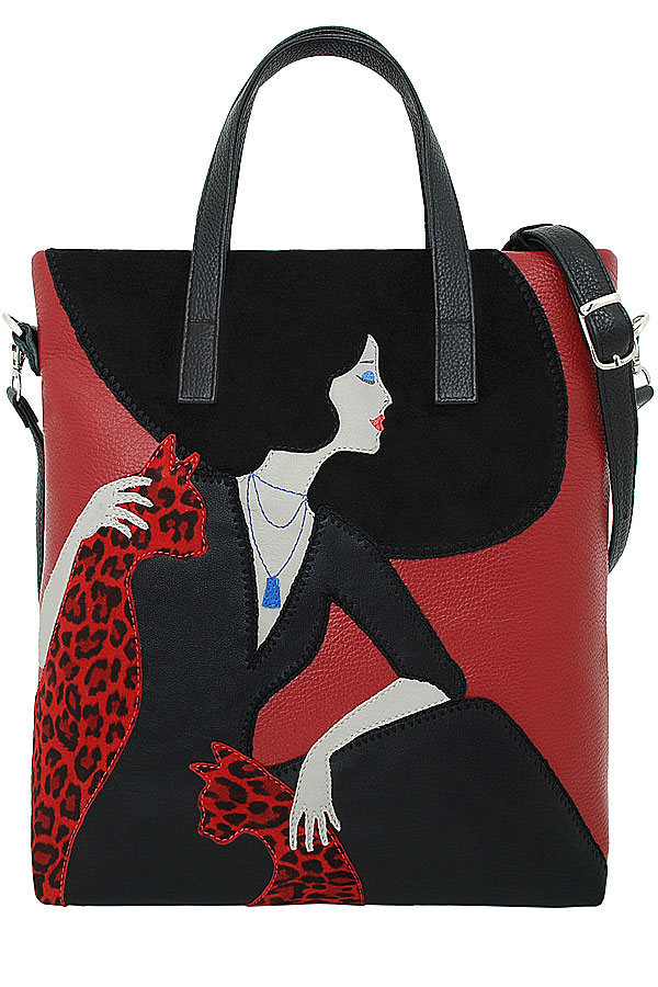 Сумка женская с аппликацией "Леди №5" с короткими ручками. Сумка застегивается на молнию и имеет одно отделение. Вмещает формат А4. В комплекте прилагается съемный регулируемый ремень через плечо. На задней стенке расположен карман на молнии. Сумка на подкладке. Внутри сумка имеет карман на молнии и карман для мобильного телефона и визиток.