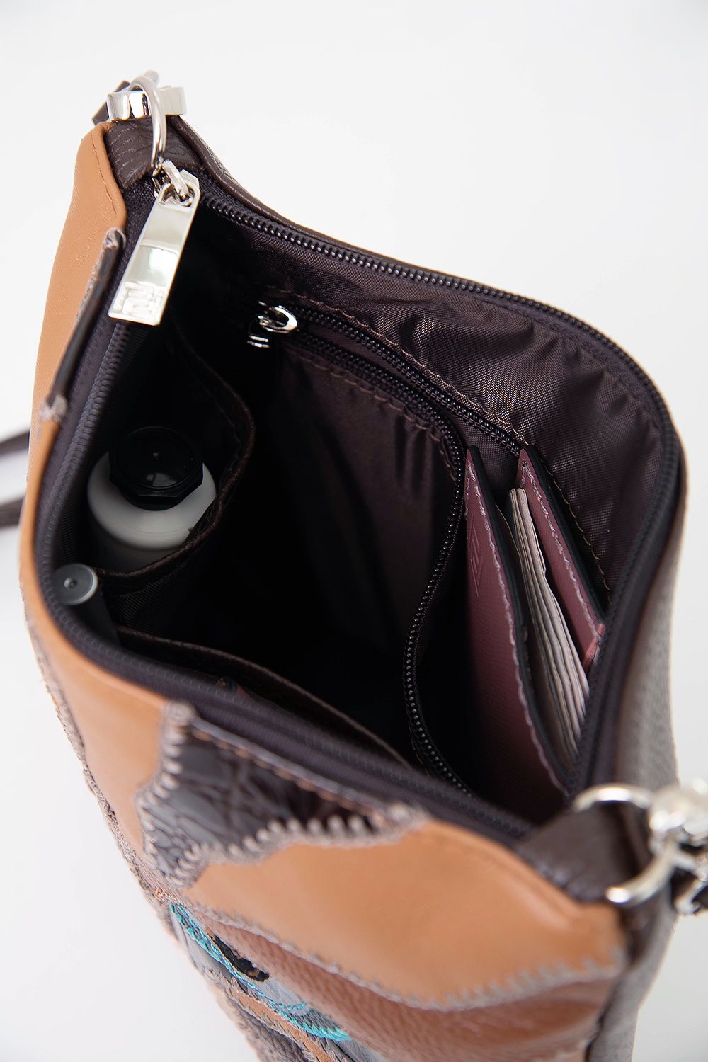 Сумка с аппликацией в заказе может незначительно отличаться от оригинала (фото) по фактуре и оттенку кожи. 24х22х3,5 см