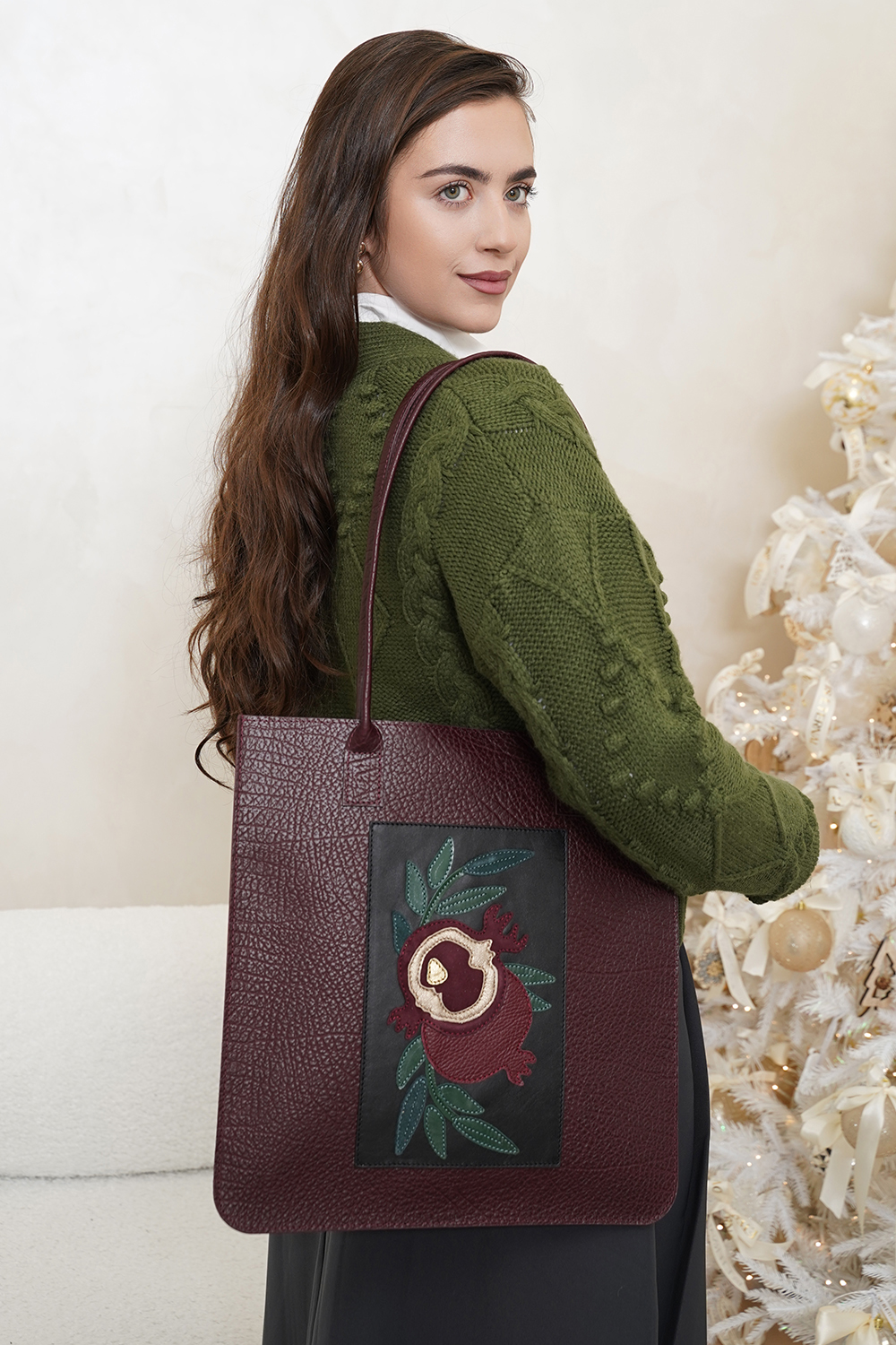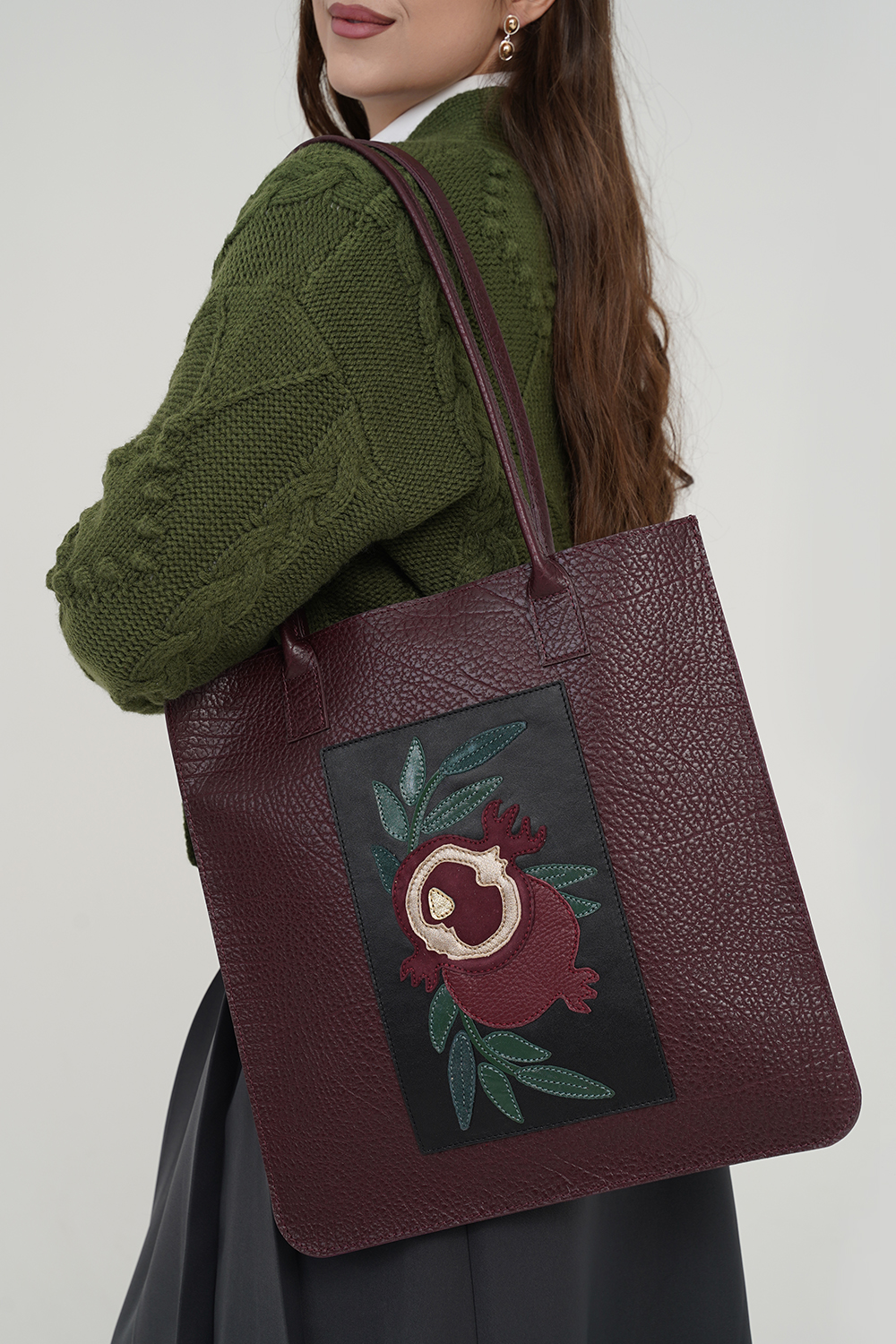 Сумка женская / шоппер, для ноутбука, с аппликацией "Гранат" с удлиненными ручками на плечо. Сумка застегивается на кнопку и имеет одно отделение. На задней стенке расположен накладной карман 24х30 см. Внутри сумка имеет накладной карман, на кнопке. 36х37х0,5