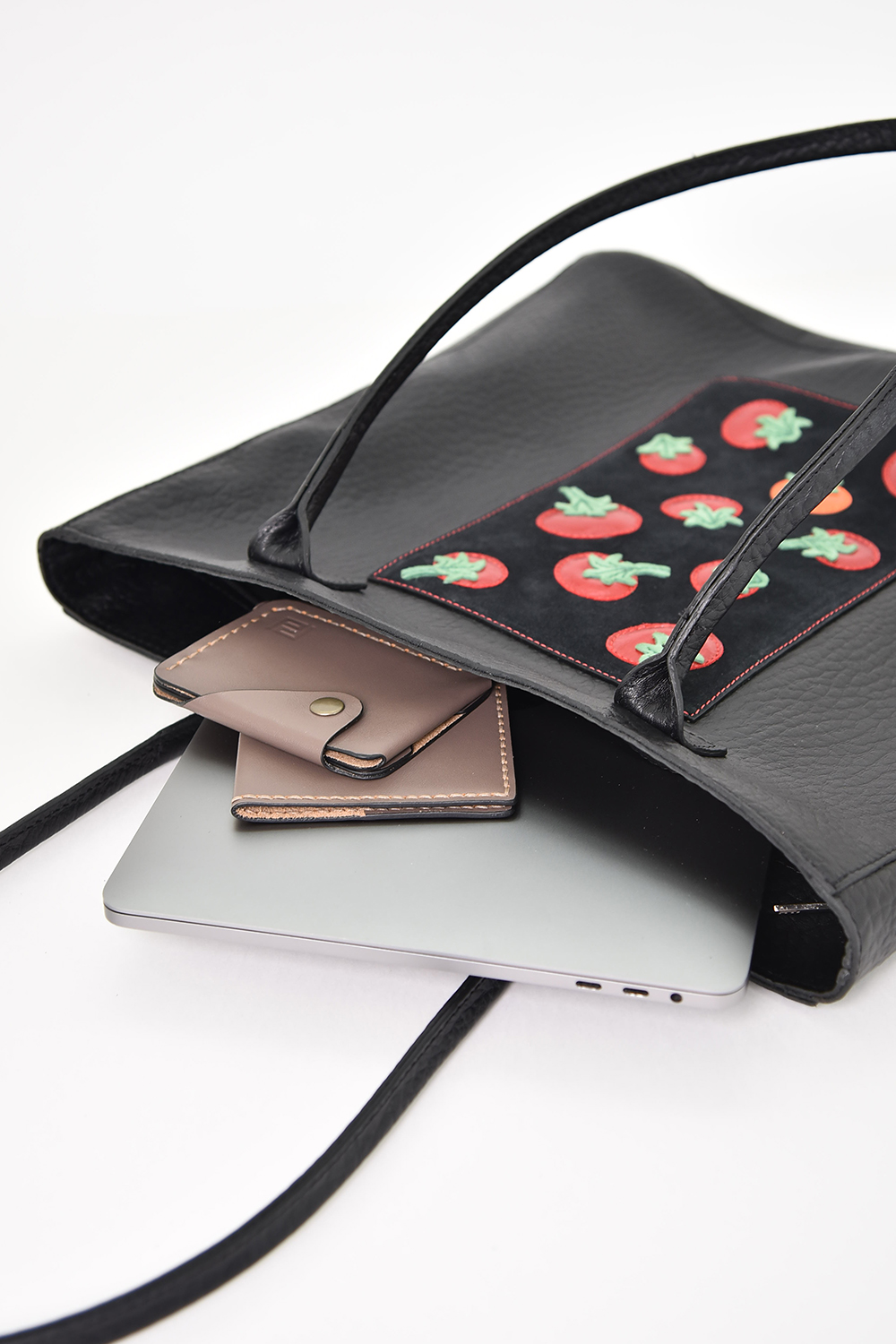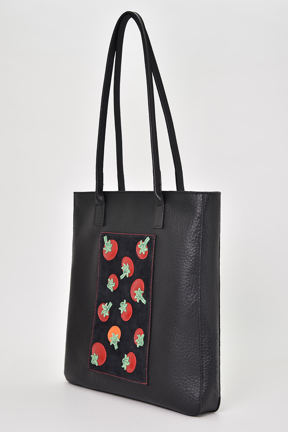 Сумка женская / шоппер, для ноутбука, с аппликацией "Помидорки" с удлиненными ручками на плечо. Сумка застегивается на молнию и имеет одно отделение. На задней стенке расположен накладной карман 24х21 см. Внутри сумка имеет накладной карман, на кнопке. 36х37х5 см