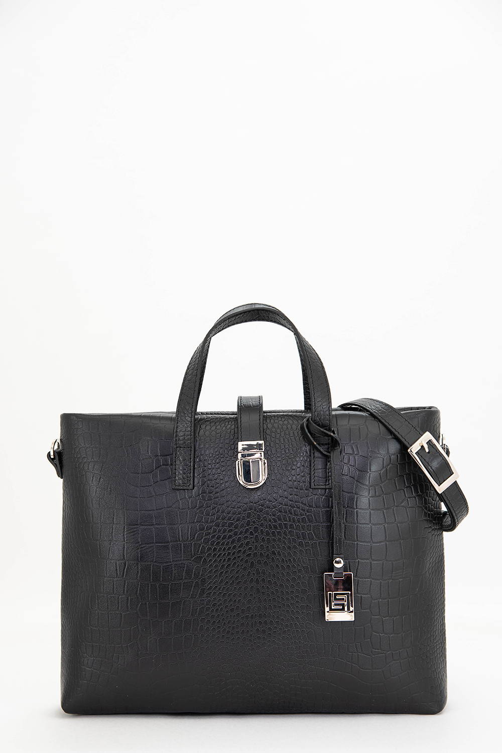 Сумка женская прямоугольной формы с короткими ручками в деловом стиле. Застегивается на молнию и хлястик с замком. Имеет одно отделение. Вмещает формат А4. В комплекте сумка имеет съемный регулируемый ремень через плечо. На задней стенке расположен карман на молнии. Сумка на подкладке. Внутри сумка имеет карман на молнии и карман для мобильного телефона и визиток.