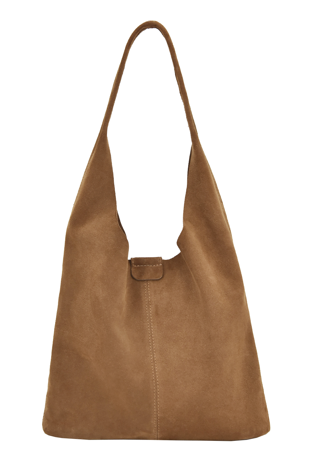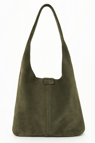 Сумка женская мягкой формы на плечо. Внутри — одно общее отделение, закрывается хлястиком на кнопке. Сумка без подкладки. Внутри: съёмная текстильная сумка, закрывается на молнию. Внутри отделения два открытых кармана и один карман молнии для ценных вещей. 56х32х12см
