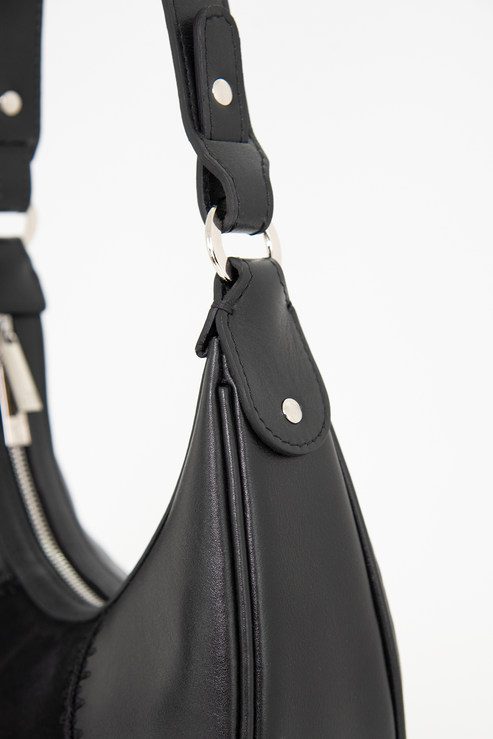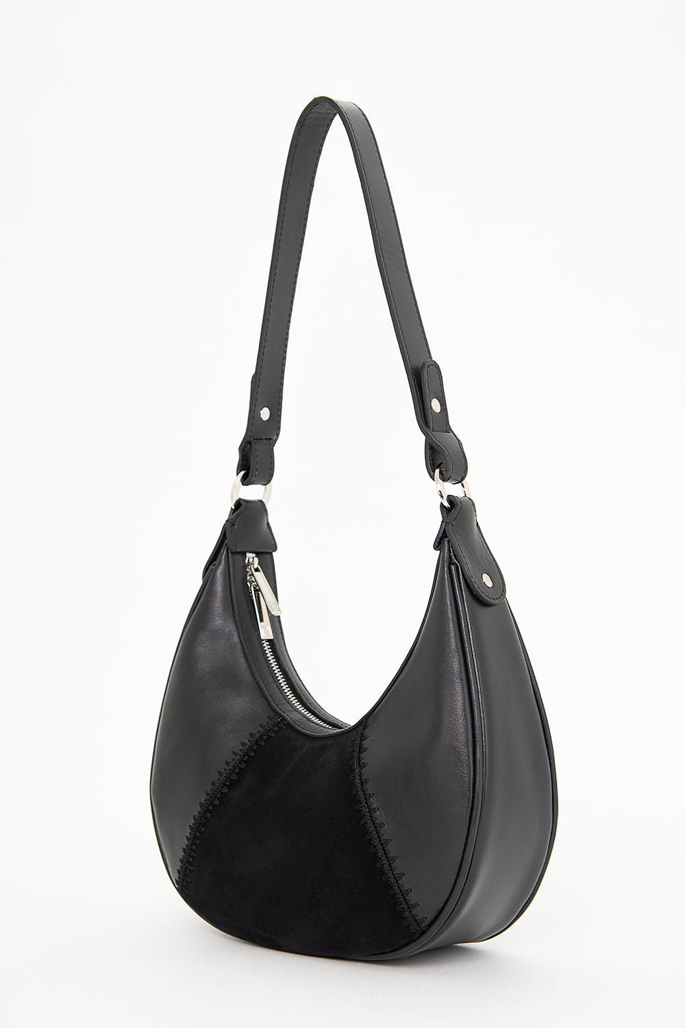 Сумка женская ДС - мягкой формы. Передняя стенка состоит из трёх частей, выполненных ажурной обвязкой. Обвязка выполнена в ручную. Сумка застегивается на молнию и имеет одно отделение. Ручка сумки крепится на кольцах и декорирована металлическими хольнитенами. На задней стенке расположен карман на молнии. Сумка на подкладке. Внутри сумки карман на молнии. 27х27х7см