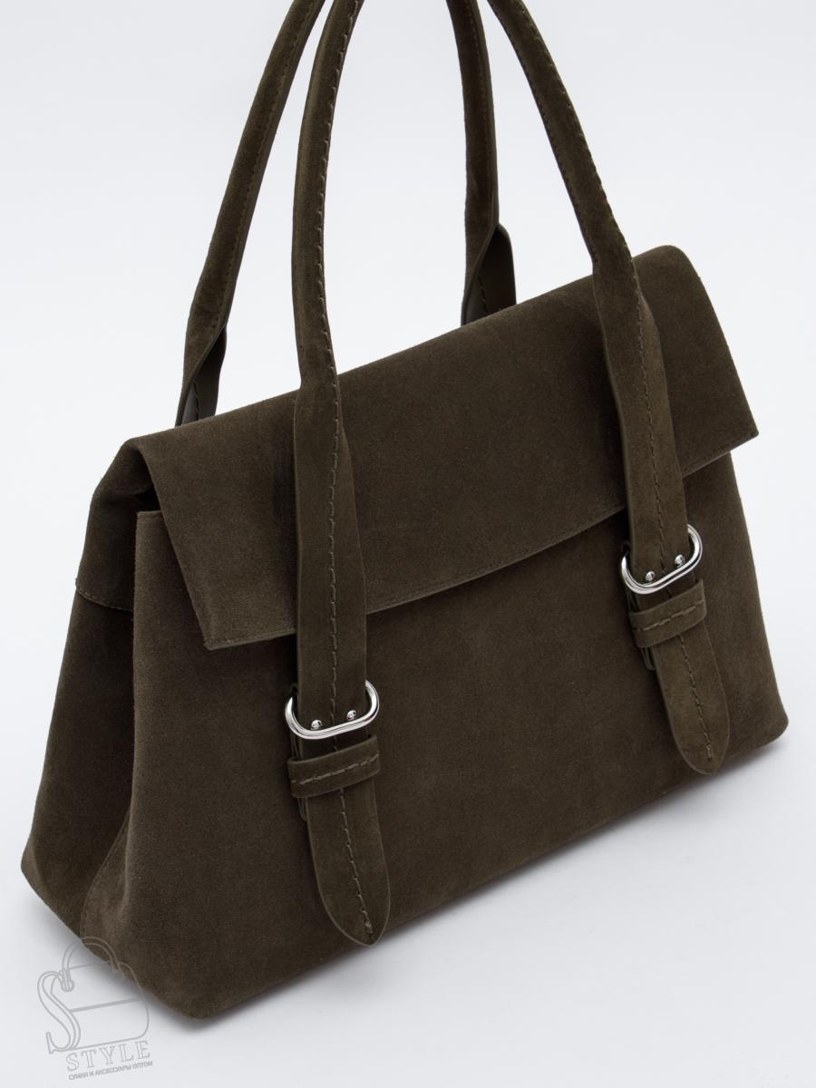 Удобная модель, выполнена из замши.  Дополнена серебристой фурнитурой. Данная модель закрывается на клапан. Каркас полужесткий. Носится в руке за встроенные ручки или на плече. В комплекте имеется съемный ремень с регулировкой длины. На дне предусмотрены ножки.