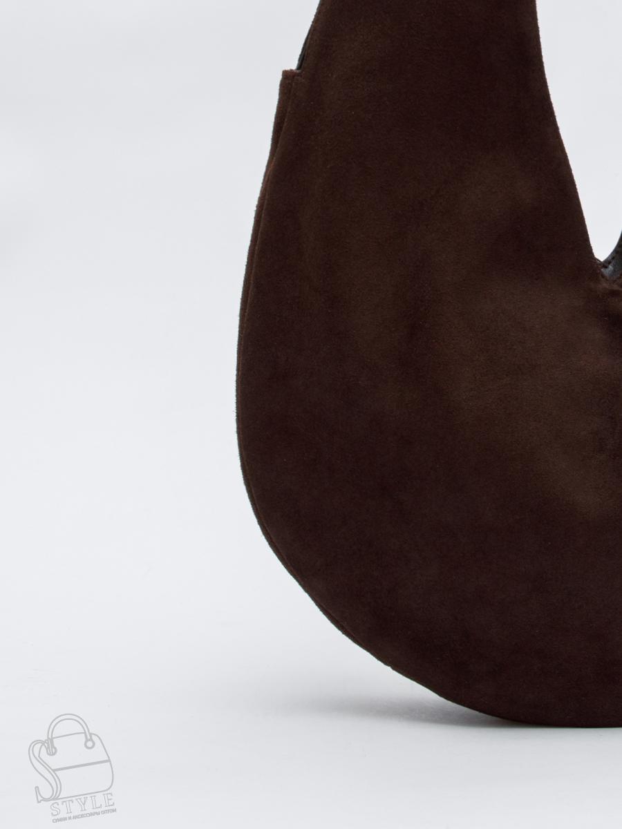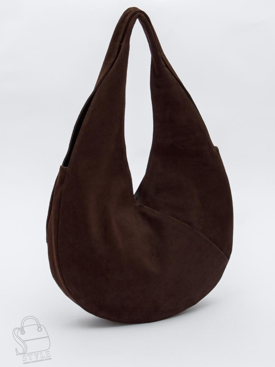 Модель-хобо, выполнена из замши. Дополнена серебристой фурнитурой. Данная модель закрывается на молнию. Носится в руке или на плече за встроенные ручки. Каркас мягкий.