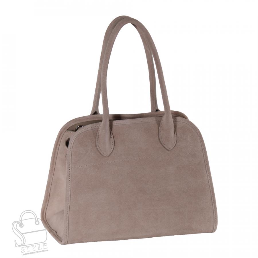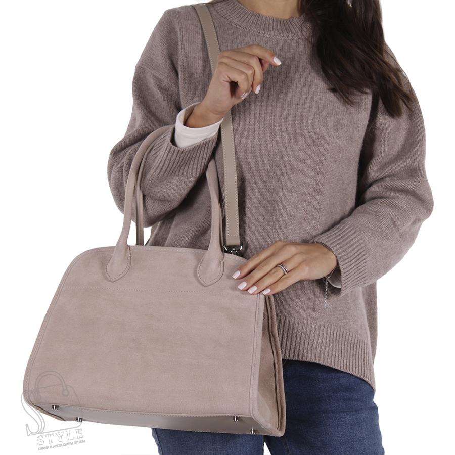 Вместительная модель, выполнена из натуральной замши.  Дополнена серебристой фурнитурой. Данная модель закрывается на молнию. Каркас мягкий. Носится на плече или в руке за ручки. В комплекте имеется съемный ремень и короткие встроенные ручки. На дне предусмотрены ножки.