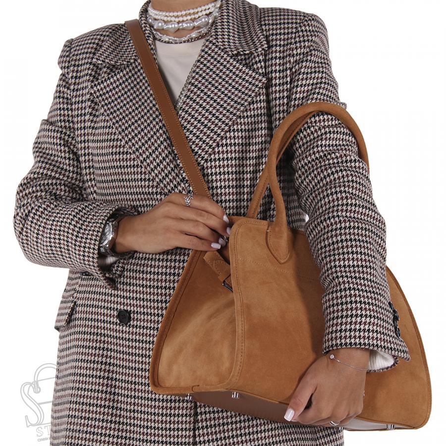 Вместительная модель, выполнена из натуральной замши.  Дополнена серебристой фурнитурой. Данная модель закрывается на молнию. Каркас мягкий. Носится на плече или в руке за ручки. В комплекте имеется съемный ремень и короткие встроенные ручки. На дне предусмотрены ножки.
