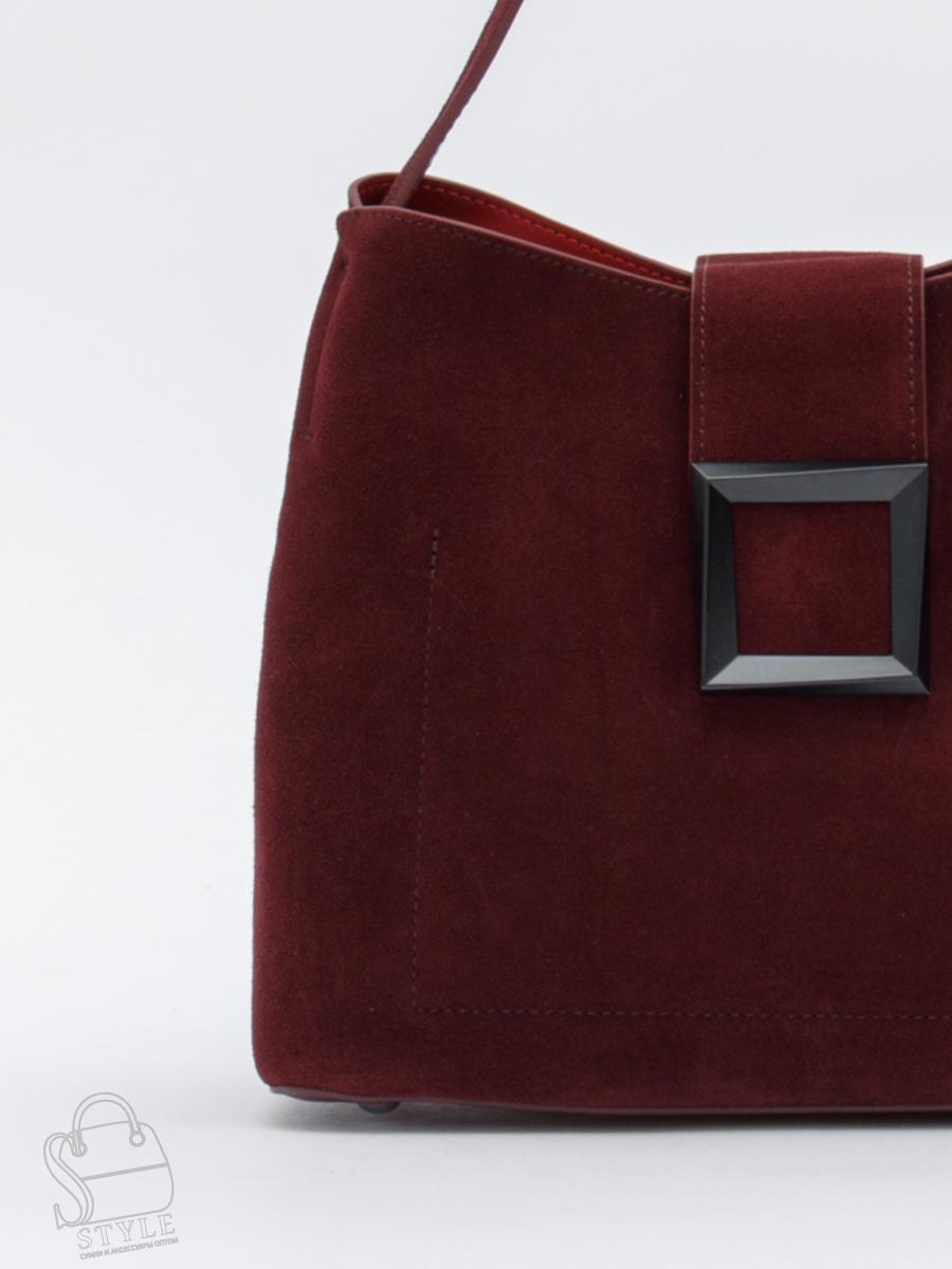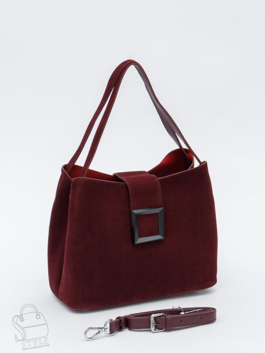 Базовая сумка, выполнена из замши. Декорирована контрастным подкладом. Дополнена серебристой фурнитурой. Данная модель закрывается на хлястик. Каркас полужесткий. Носится в руке за встроенные ручки, или на плече. В комплекте имеется съемный ремень с регулировкой длины.