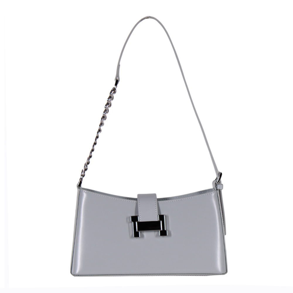 Стильная сумка в минималистичном дизайне, выполнена из натуральной кожи. Декорирована пряжкой. Дополнена серебристой фурнитурой. Данная модель закрывается на хлястик. Каркас жесткий. Сумка носится на плече за ремень. ремень декорирован цепочкой.