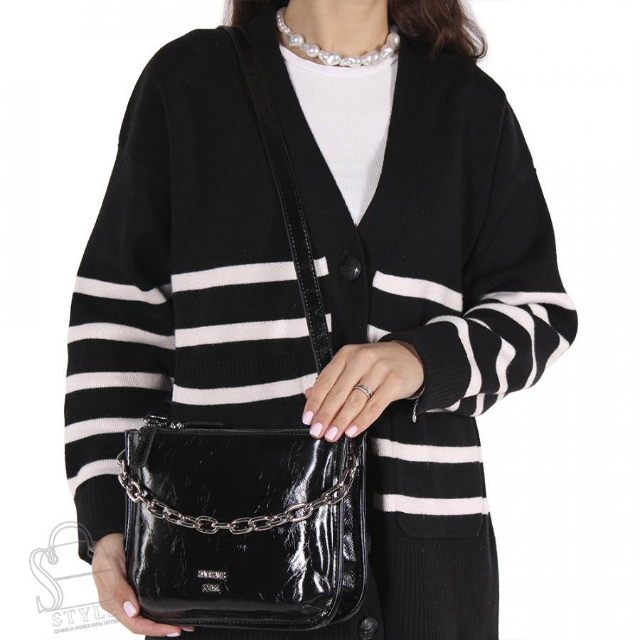 Модель кросс-боди, выполнена из натуральной кожи. Декорирована цепочкой. Дополнена серебристой фурнитурой. Данная модель закрывается на молнию. Каркас полужесткий. Носится на плече. В комплекте имеется ремень с регулировкой длины.