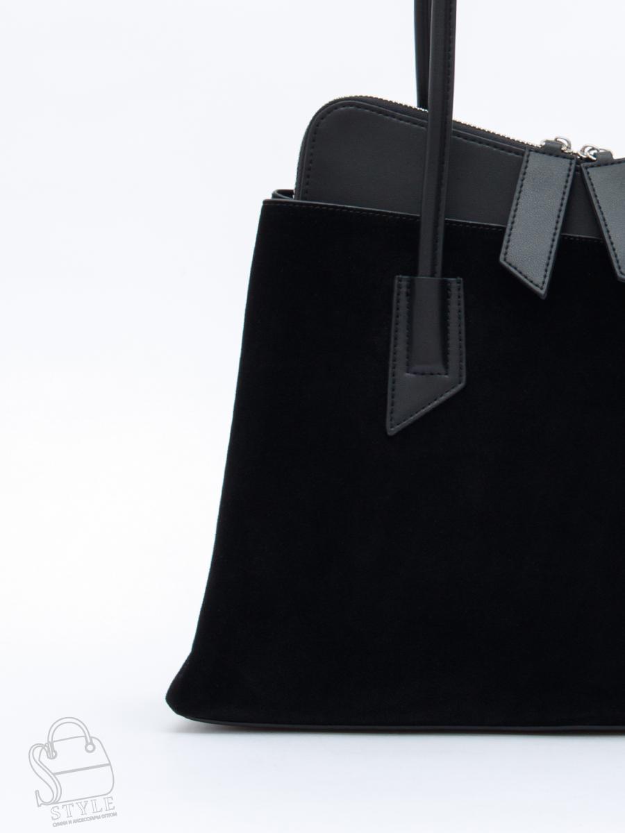 Эффектная сумка ассиметричной формы, выполнена из замши и кожи. Дополнена серебристой фурнитурой. Данная модель закрывается на молнию, носится в руке или на плече за встроенные ручки. на ручках имеется фиксатор. Каркас полужесткий.