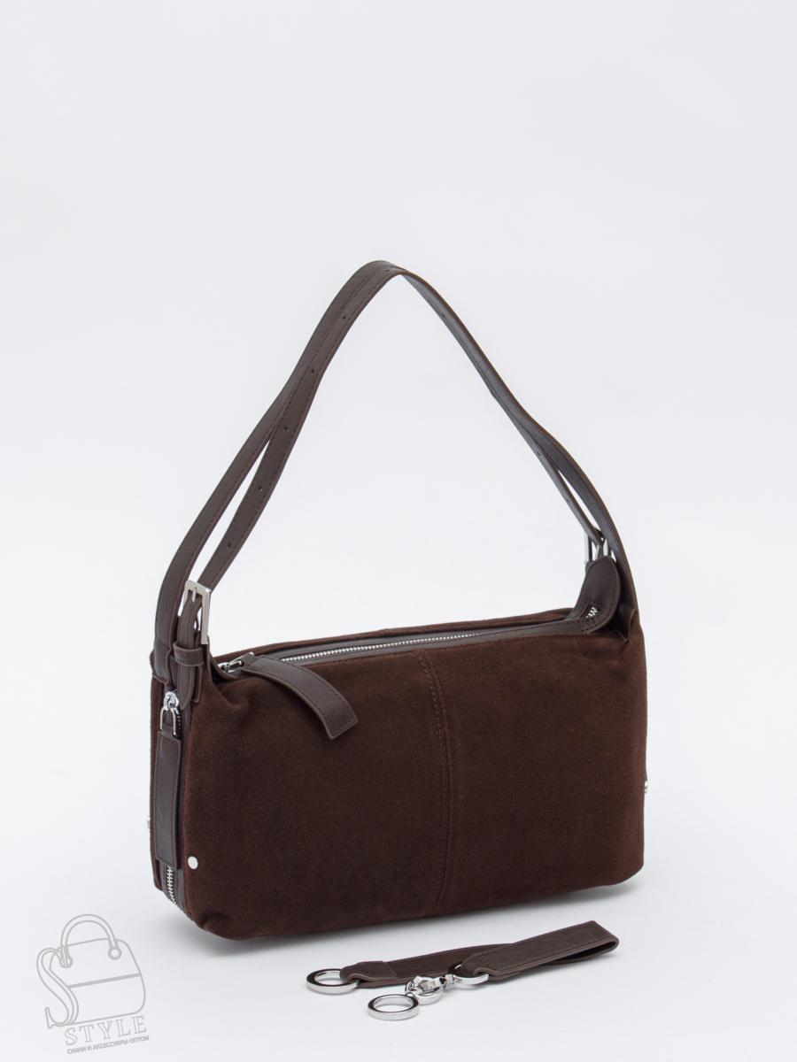 Базовая сумка, выполнена из замши. Декорирована брелоком на "собачке". Дополнена серебристой фурнитурой. Данная модель закрывается на молнию. Каркас мягкий. Носится в руке за встроенные ручки с регулировкой длины, или на плече. В комплекте имеется удлиняющий элемент.