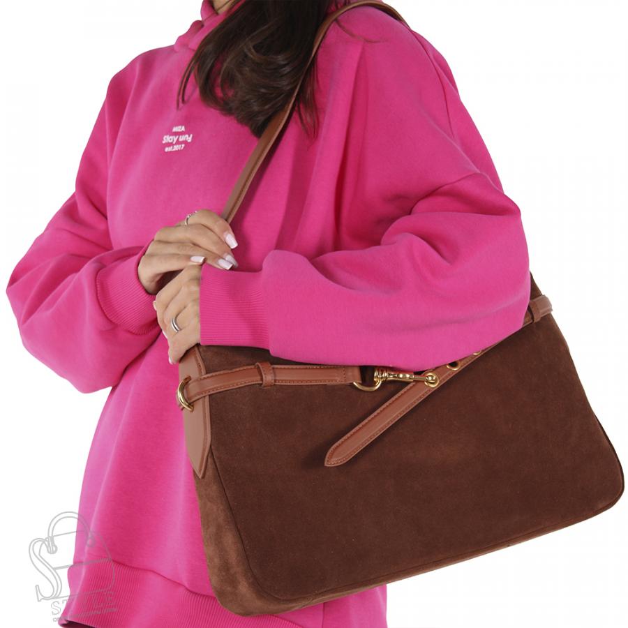 Модель со встроенной ручкой, выполнена из замши. Декорирована ремнем на передней части. Дополнена серебристой фурнитурой. Данная модель закрывается на молнию. Каркас мягкий. Носится сумка через плечо.