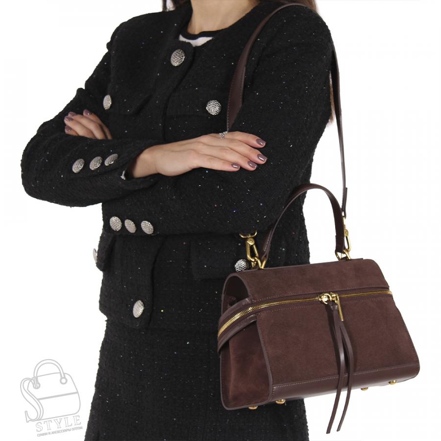 Стильная модель, выполнена из замши. Дополнена золотистой фурнитурой. Данная модель закрывается на молнию, носится на плече или в руке за ручку. В комплекте имеется съемный ремень. Каркас полужесткий. На дне предусмотрены ножки. Удлиненная молния фиксируется на магнитах.