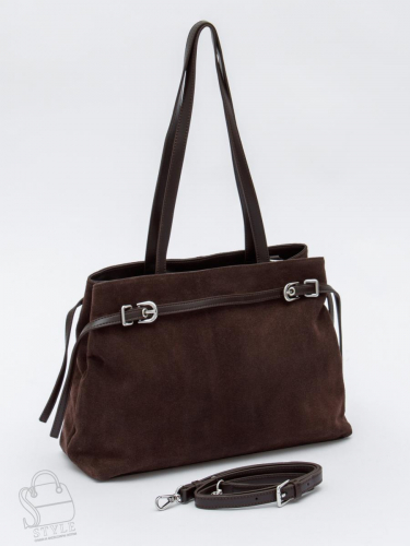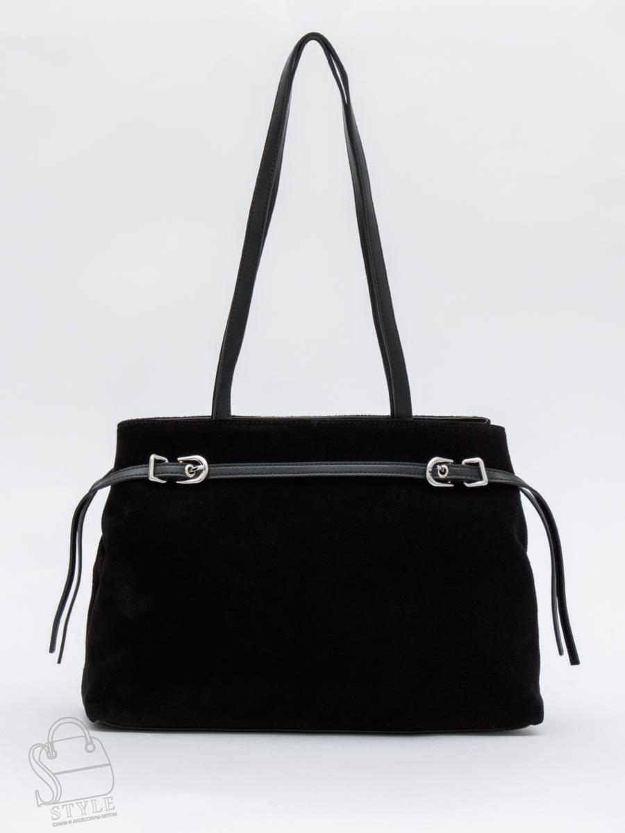 Базовая сумка, выполнена из замши. Декорирована ремнями на корпусе. Дополнена серебристой фурнитурой. Данная модель закрывается на молнию, носится в руке за встроенные удлиненные ручки или на плече. В комплекте имеется ремень с регулировки длины. Каркас полужесткий.