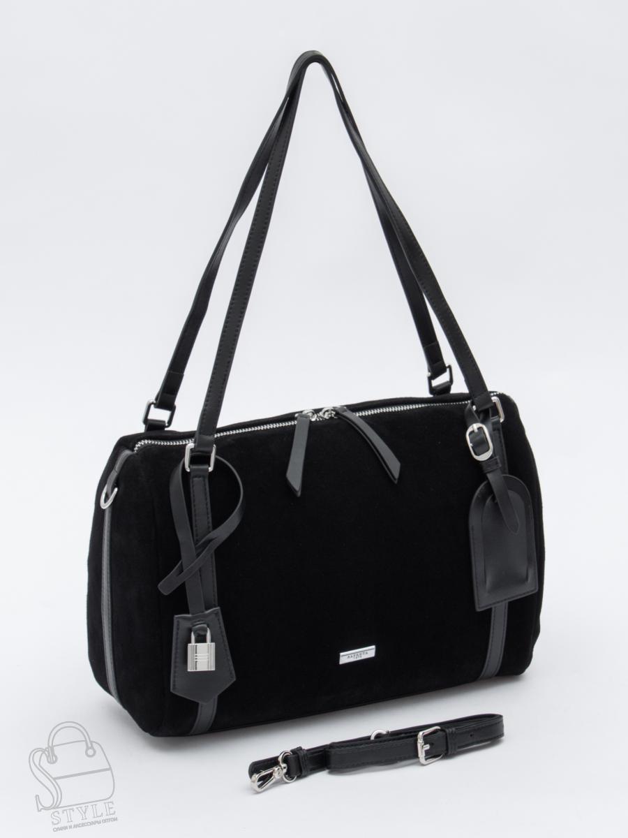 Базовая сумка, выполнена из замши. Декорирована брелоком. Дополнена серебристой фурнитурой. Данная модель закрывается на молнию. Каркас мягкий. Носится в руке за встроенные ручки, или на плече. В комплекте имеется съемный ремень с регулировкой длины.
