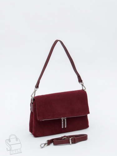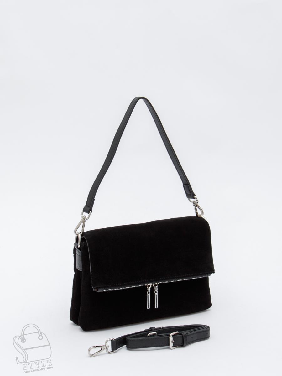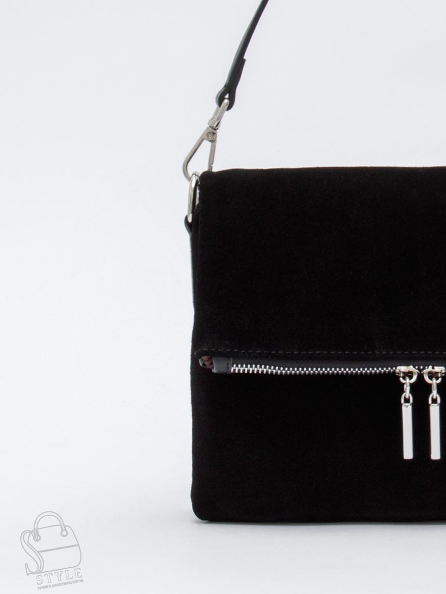 Модель кросс-боди, выполнена из замши. Дополнена серебристой фурнитурой. Данная модель закрывается на клапан. Каркас полужесткий. Носится в руке за съемную удлиненную ручку или на плече. В комплекте имеется съемный ремень с регулировкой длины.